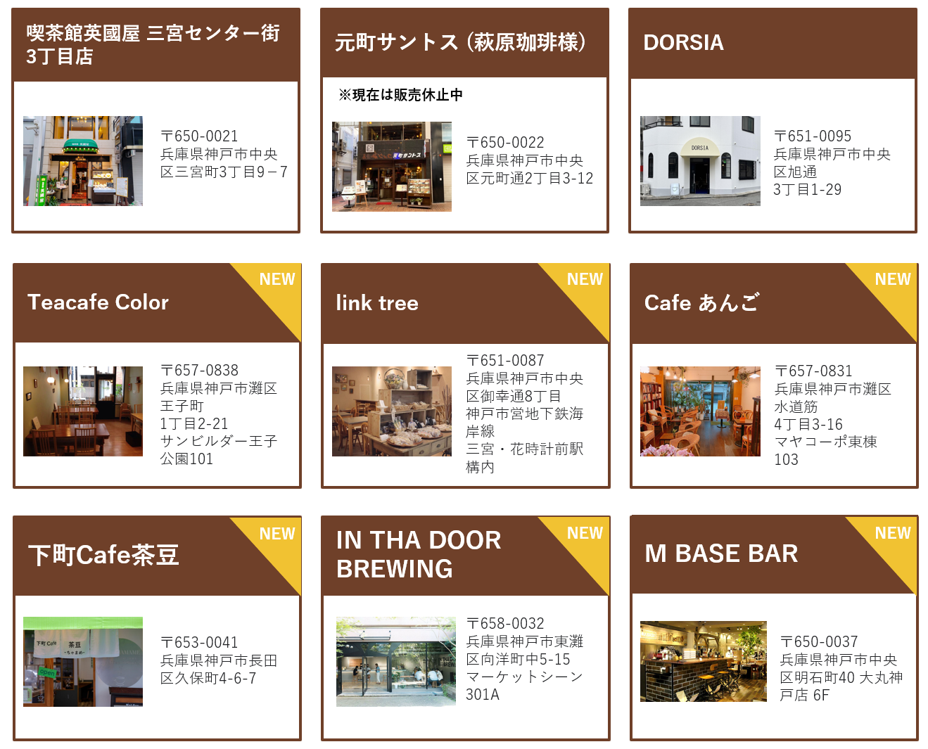 ②新たに「Link tree」「M BASE BAR」「Teacafe Colour」「Cafe あんご」「IN THA DOOR BREWING」「下町Cafe 茶豆」の6店が神戸チーズトーストを販売