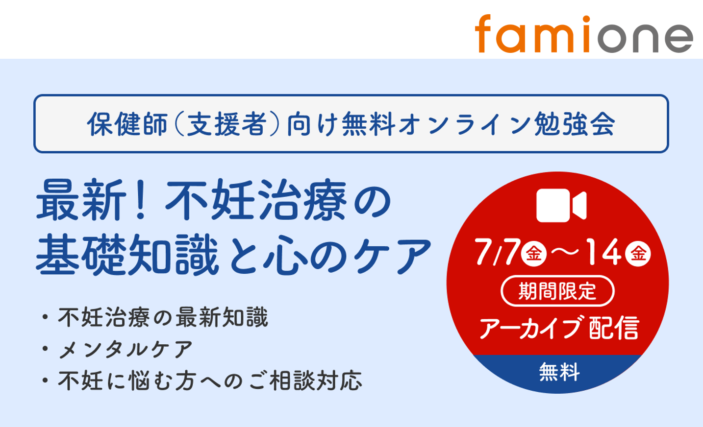 自治体の皆さまから「性と健康の相談センター」事業の開始、不妊治療の保険適応に伴い自治体や企業で働く保健師は不妊治療についての相談に対応する場面が増えているという声を受けて、保健師(支援者)が学ぶ場として、「最新!不妊治療の基礎知識と心のケア」をテーマに7月6日に無料勉強会をオンライン開催いたしました。