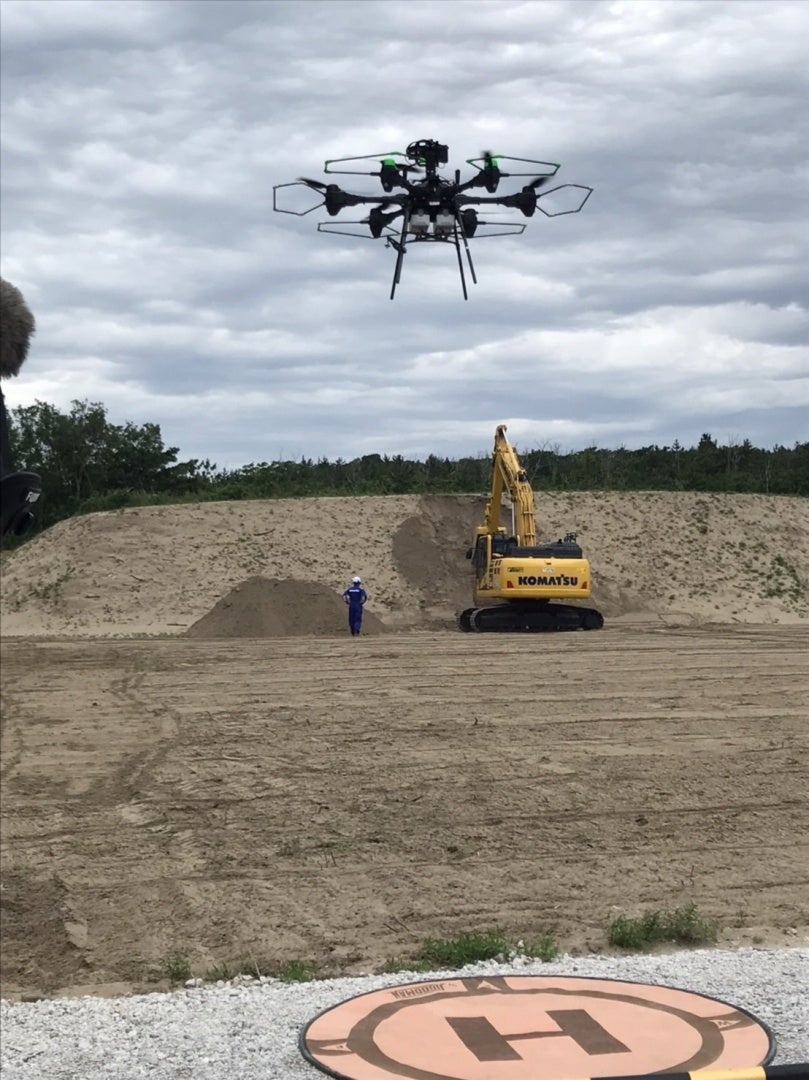 ドローンに搭載したレーザースキャナのデータを地上で受信し、リアルタイムに3次元化(点群化)処理した映像を大型ディスプレイに映しながら、ドローンレーザーを使った3次元測量技術を紹介しました。