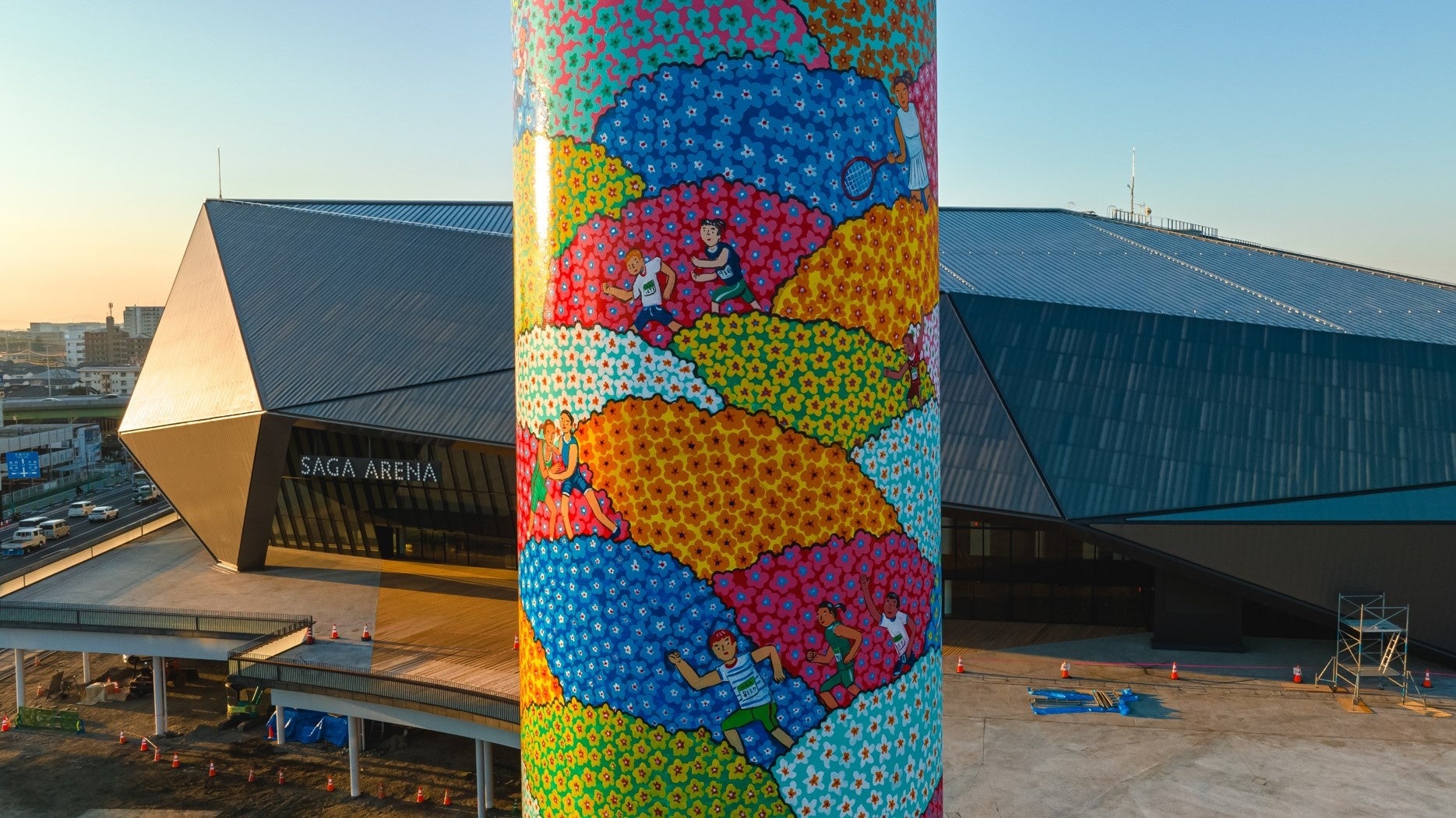 「スポーツとSuper Happyな人生を」をテーマに描き、シンボルの太陽やカモメには平和への想いも込められた、 アート作品は、佐賀県の人たちと一緒に描かれました。
