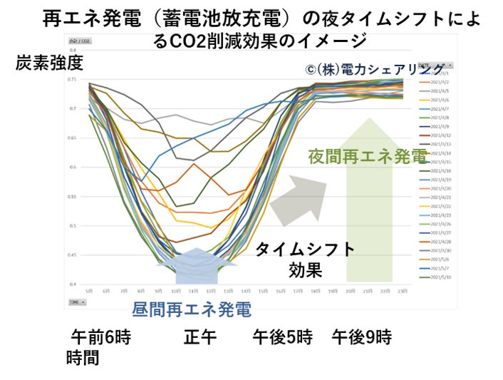 夜間からのタイムシフト効果は、状況によってまちまちで、特殊な条件下では、夜間から昼間に電力消費をタイムシフトした結果、CO2排出量が増えてしまった、などということも起き得ます。