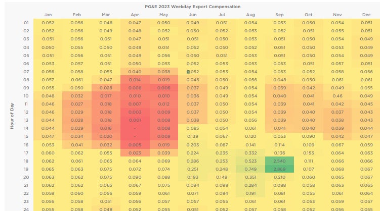 カリフォルニア州の導入する月別・時間帯別に事前に設定される余剰売電単価(USD)