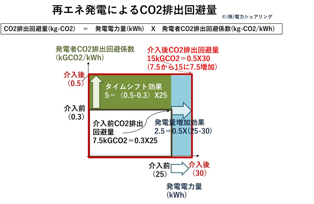 当社の特許技術を用いて、各電力供給が「電力を、いつ、どのくらい発電しているか。その時間帯のCO2排出係数(炭素強度)はどの程度か」に応じて各発電者の発電・放電による系統への売却時の系統の期間通算平均CO2排出削減回避係数(その供給者固有の炭素強度との差分)=炭素強度減分(kgCO2/kWh)を算定し、その絶対値や増加量(あるいは発電・放電量(kWh)や、その排出回避係数(炭素強度)との積でのCO2排出削減量(kgCO2)の絶対値や増加量と組み合わせて)に応じて、売電価格を積み増したり、ポイントを付与することで上記の問題点が解決できると考えます。