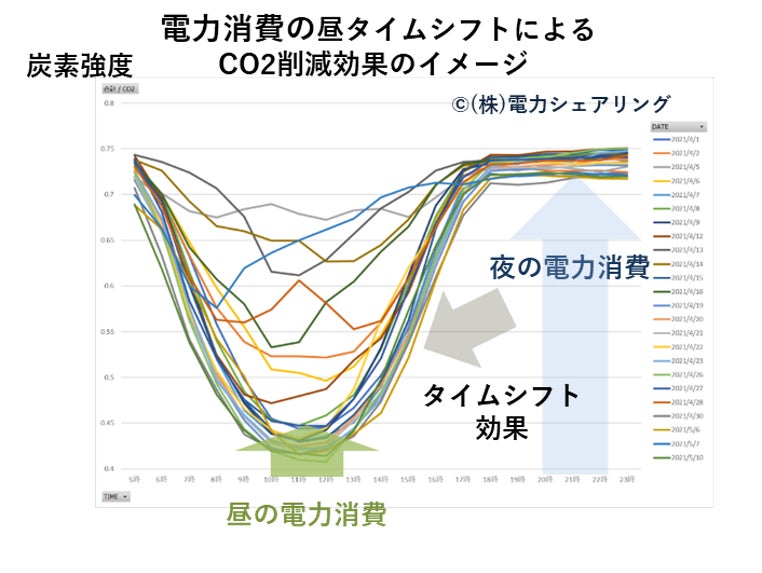 このため、各時間帯を通算した全体の電力消費量を増やさないで、夜の消費を昼にタイムシフトすることを明確に訴求すること。また、その目的としては、再エネの有効活用や、負荷の平準化のみならず、電力消費によるCO2削減を大目標として据えることが肝要です。
