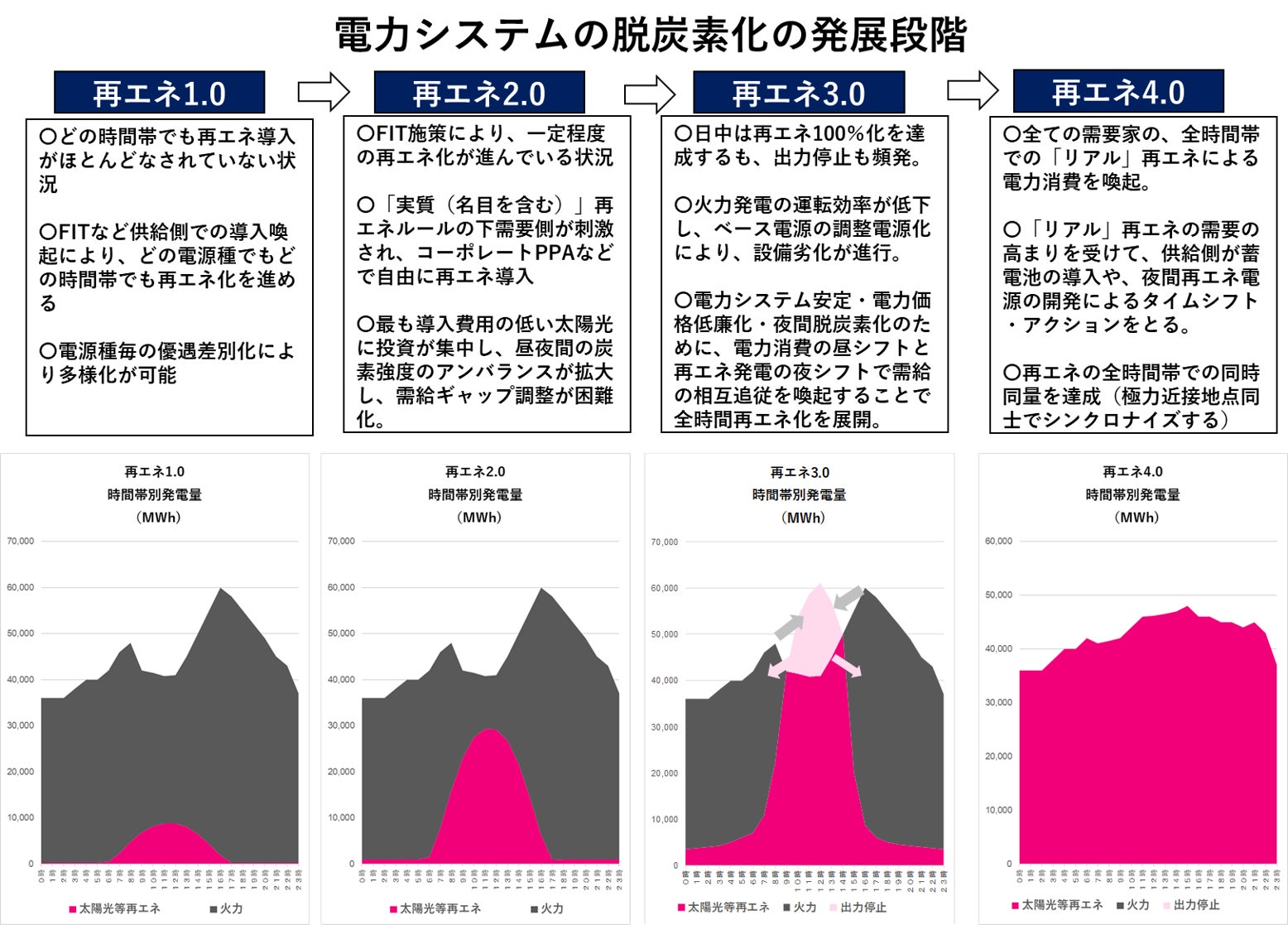 当社では2017年の創立以来、この課題に取り組んでおり、当社独自の「再エネ3.0」論を提唱しています。これは、再エネ100%の電力システムの脱炭素化に向けては、4つの発展段階を経て、現実的なロードマップを描いていくことが必要であり、現在は再エネ2.0から3.0への移行期であるという考え方です。
