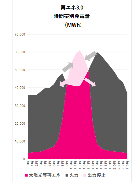再エネ3.0では、とうとう再エネ発電が需要を上回る時間が発生するため、電力システムの安定化対策が必要となってきます。