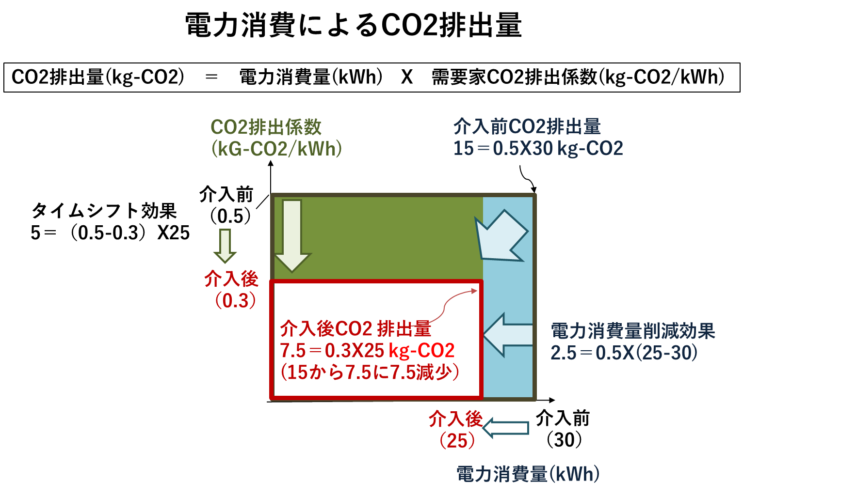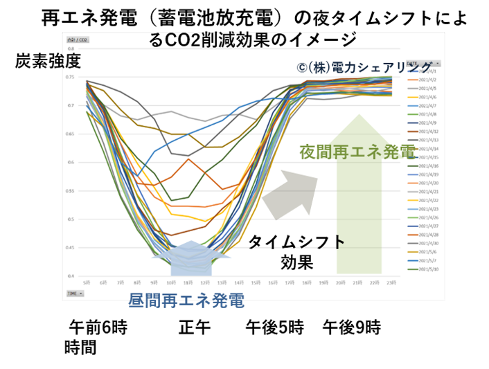 夜間からのタイムシフト効果は、状況によってまちまちで、特殊な条件下では、夜間から昼間に電力消費をタイムシフトした結果、CO2排出量が増えてしまった、などということも起き得ます。