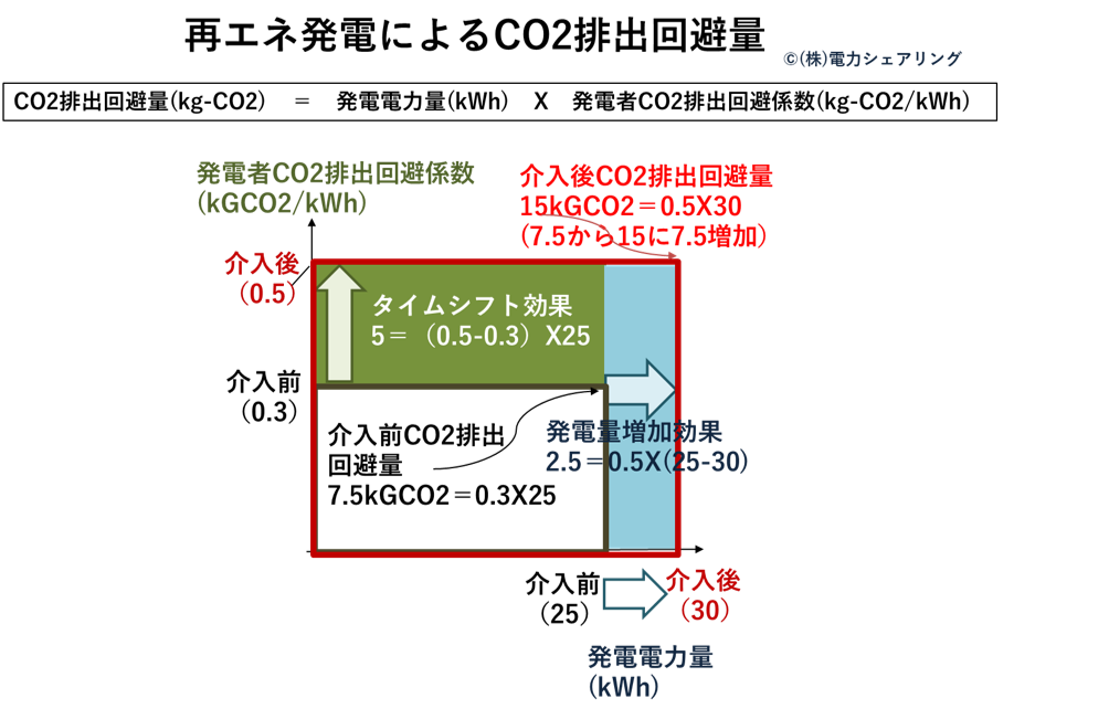 当社の特許技術を用いて、各電力供給が「電力を、いつ、どのくらい発電しているか。その時間帯のCO2排出係数(炭素強度)はどの程度か」に応じて各発電者の発電・放電による系統への売却時の系統の期間通算平均CO2排出削減回避係数(その供給者固有の炭素強度との差分)=炭素強度減分(kgCO2/kWh)を算定し、その絶対値や増加量(あるいは発電・放電量(kWh)や、その排出回避係数(炭素強度)との積でのCO2排出削減量(kgCO2)の絶対値や増加量と組み合わせて)に応じて、売電価格を積み増したり、ポイントを付与することで上記の問題点が解決できると考えます。