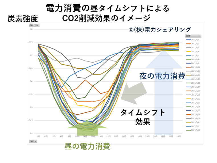 このため、各時間帯を通算した全体の電力消費量を増やさないで、夜の消費を昼にタイムシフトすることを明確に訴求すること。また、その目的としては、再エネの有効活用や、負荷の平準化のみならず、電力消費によるCO2削減を大目標として据えることが肝要です。
