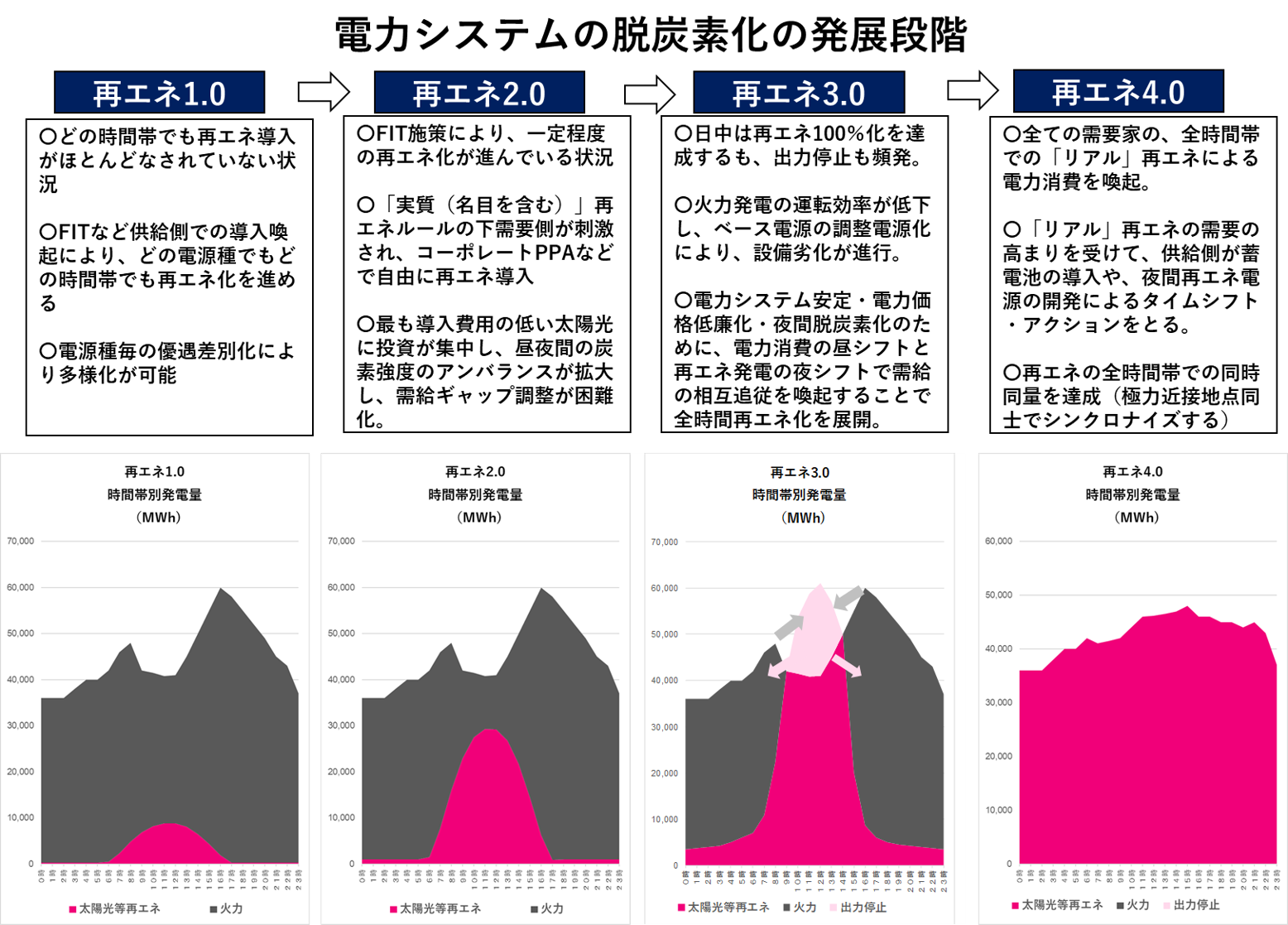 当社では2017年の創立以来、この課題に取り組んでおり、当社独自の「再エネ3.0」論を提唱しています。これは、再エネ100%の電力システムの脱炭素化に向けては、4つの発展段階を経て、現実的なロードマップを描いていくことが必要であり、現在は再エネ2.0から3.0への移行期であるという考え方です。