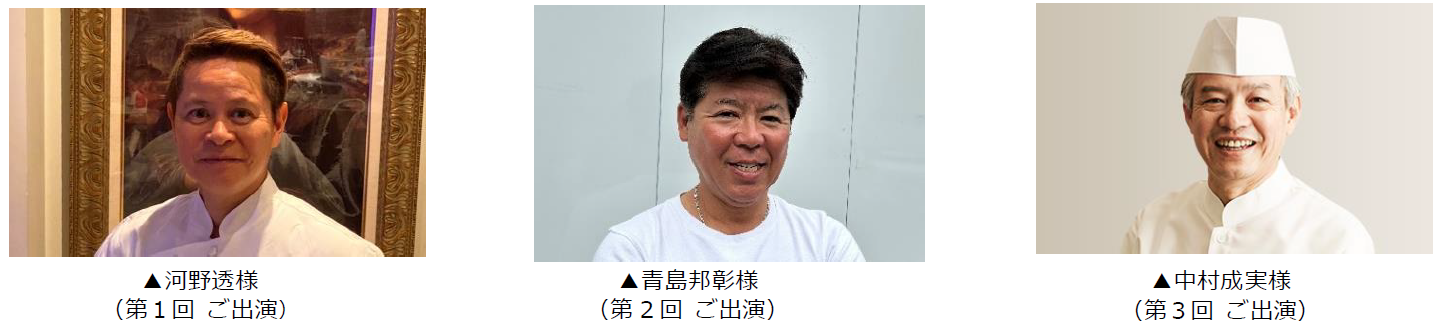 ■ケアシェル株式会社 取締役 山口慶子様 ■サローネグループ 統括料理長 樋口敬洋様 ■byebyeblues TOKYO 料理長 永島義国様 |
