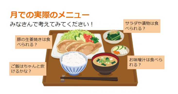 将来的に月で食事する際に地上で食べるようなメニューを実現することができるかなどをクイズ形式で紹介し、月で生活する際の食事について具体的なイメージを膨らませることができました。