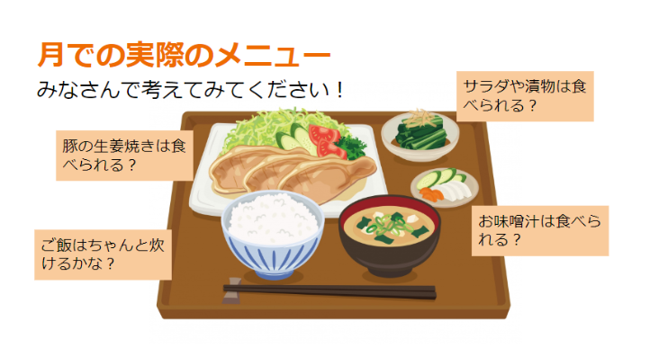 将来的に月で食事する際に地上で食べるようなメニューを実現することができるかなどをクイズ形式で紹介し、月で生活する際の食事について具体的なイメージを膨らませることができました。
