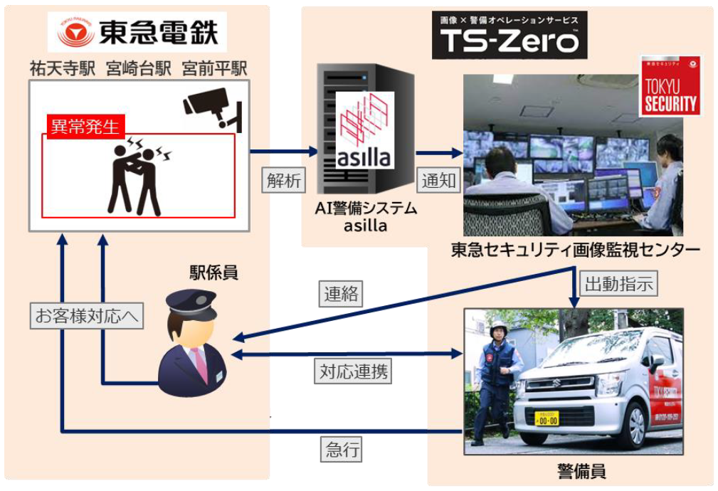 東急電鉄株式会社(以下、「東急電鉄」)、東急セキュリティ株式会社(以下、「東急セキュリティ」)、株式会社アジラ(以下、「アジラ」)は、東急電鉄の駅構内において、東急セキュリティが提供する画像×警備オペレーションサービス「TS-Zero(ティーエスゼロ)」(以下、「TS-Zero」)のサービスラインナップであるAI警備システム「asilla(アジラ) 」(以下、「asilla」)を活用し、駅係員・警備員が連携した警備オペレーションについての実証実験(以下、「本実証実験」)を2023年7月11日(火)より開始します。