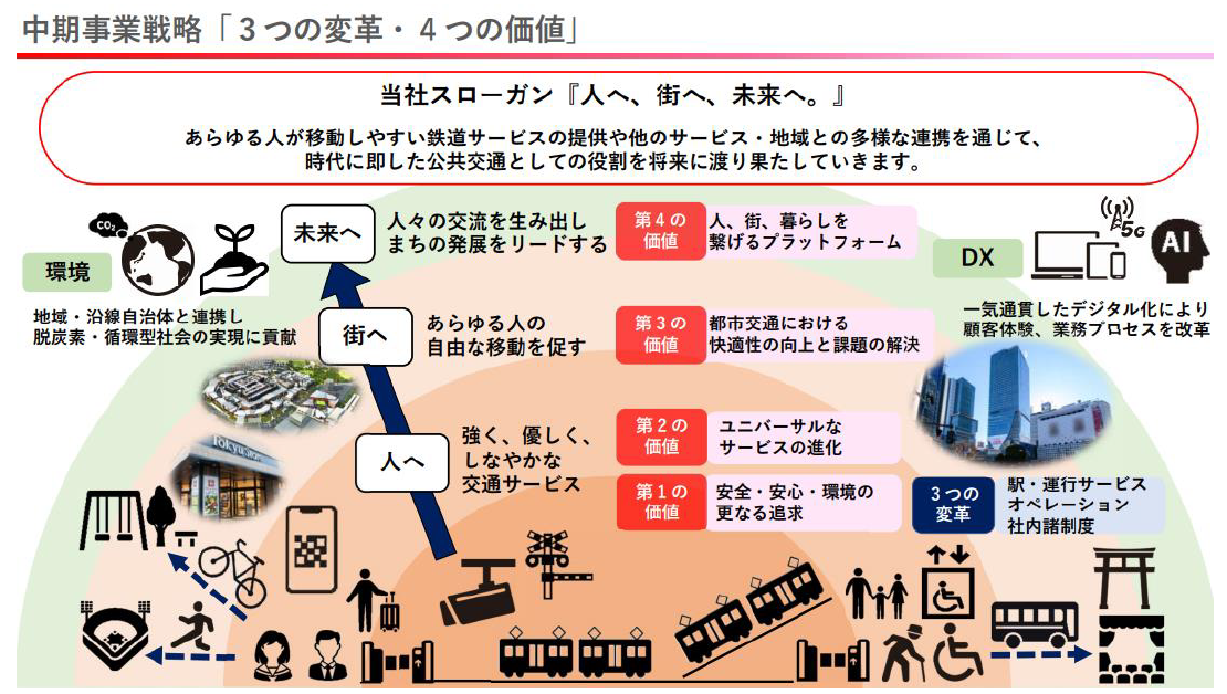当社は、2021年5月に公表した中期事業戦略「3つの変革・4つの価値」に基づき、固定費削減、生産性向上を目的とした事業構造改革をはじめとする経営努力を徹底しながら、鉄道インフラを適切に維持・更新し、公共交通としての使命を果たし続けるために必要な取り組みを進めています。