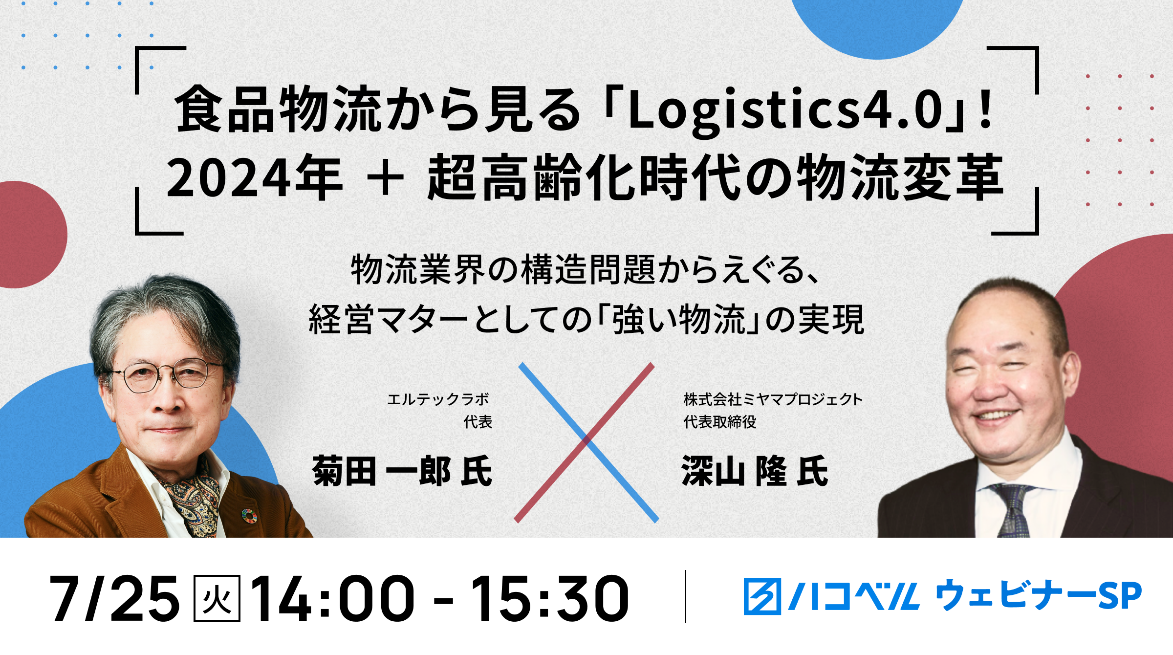 物流プラットフォーム「ハコベル」を展開するハコベル株式会社(本社:東京都品川区、代表取締役社長CEO:狭間 健志、以下:ハコベル)は7月25日(火)に、株式会社ミヤマプロジェクト 代表取締役 深山 隆氏、 L-Tech Lab 菊田 一郎氏の両名をお迎えし「食品物流から見る 『Logistics4.0』!2024年+超高齢化時代の物流変革」を開催することをお知らせいたします。