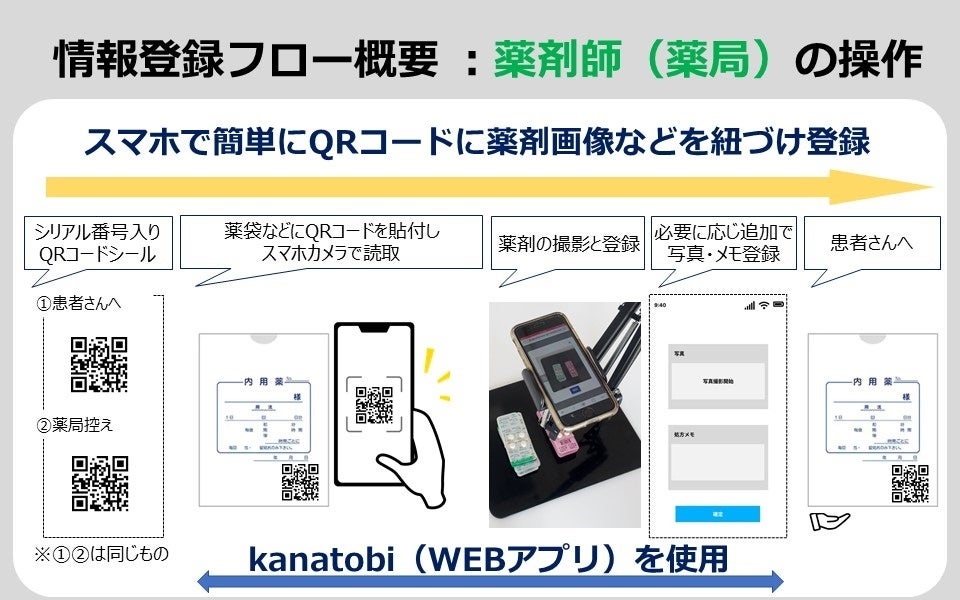 →処方箋調剤における薬剤の受け渡しに起因する問い合わせの削減、および問い合わせ対応時のコミュニケーションをスムーズに実施することを目的として、交付する薬剤の現物画像をスマートフォンで撮影し患者さんに簡単に共有できるシステム「kanatobi(カナトビ)」を開発した。