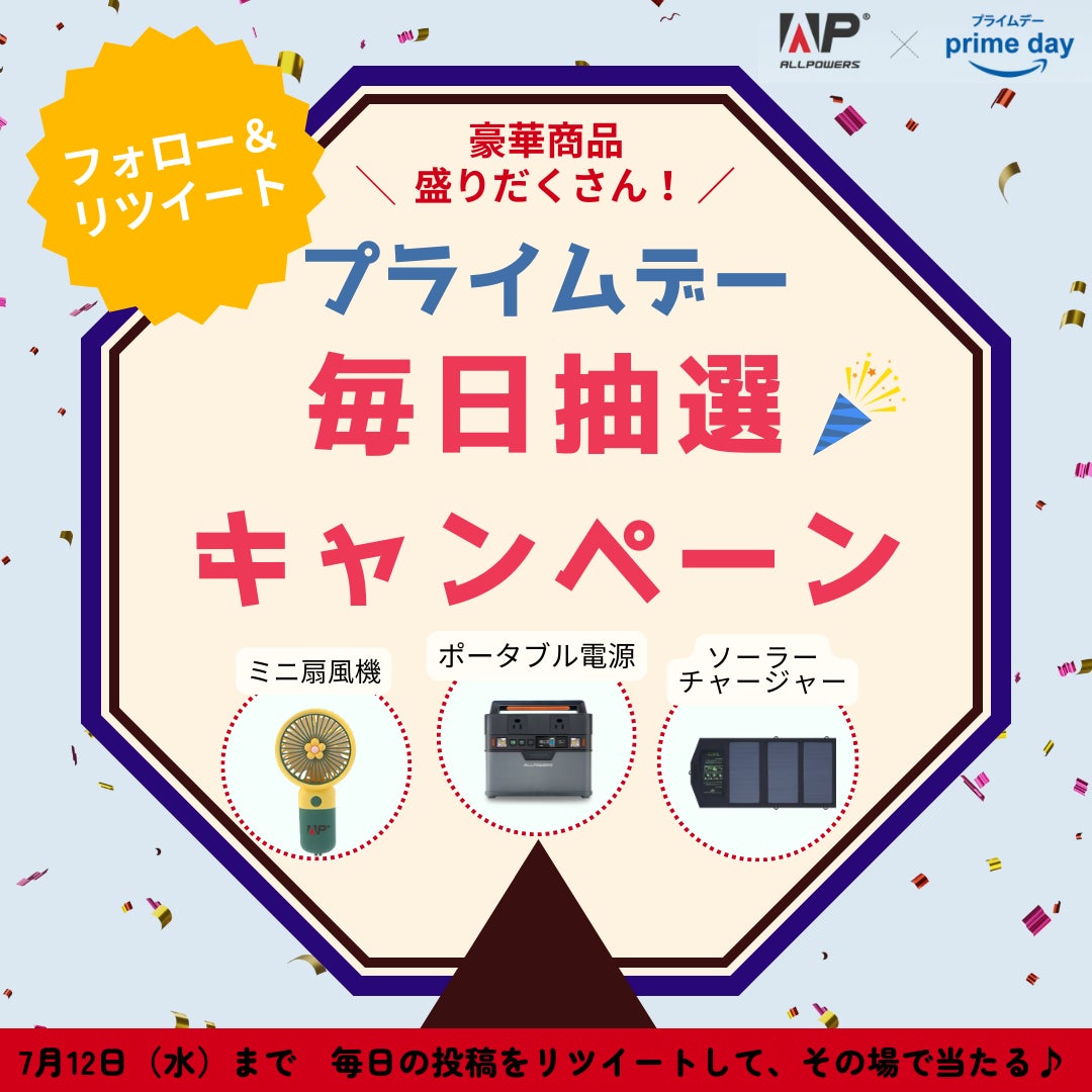 7月12日まで、公式Twitterアカウントにて開催された「プライムデー応援毎日抽選キャンペーン」にご応募いただいた方の中から、毎日抽選でポータブル電源やソーラーパネルをプレゼントします。