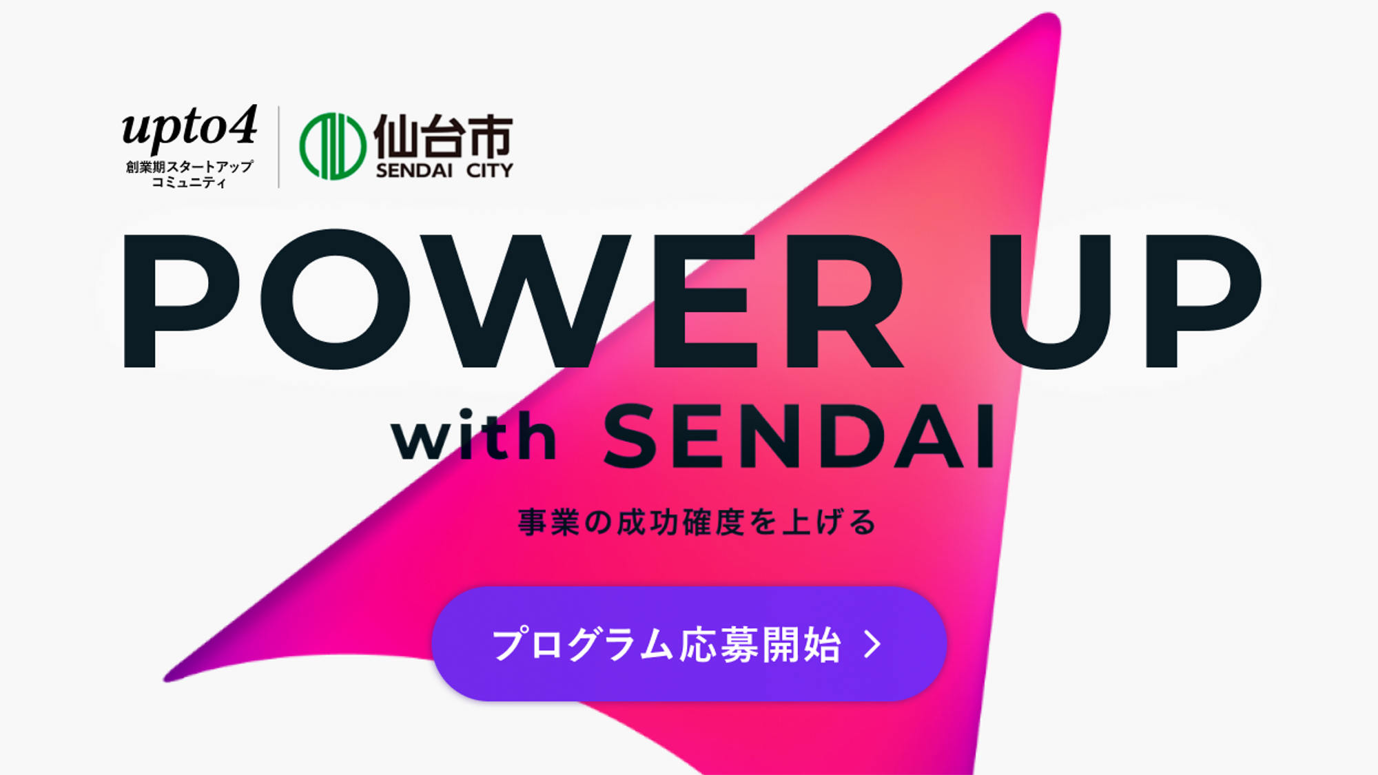仙台・東北から社会的・経済的インパクトの創出を目指すスタートアップを支援する仙台市は、研究開発型スタートアップの経営層コミュニティを運営するupto4株式会社と共に、仙台・東北のスタートアップの事業の成功確度向上を支援するため、「CxO候補マッチング&資金調達伴走プログラム」の募集を開始します。