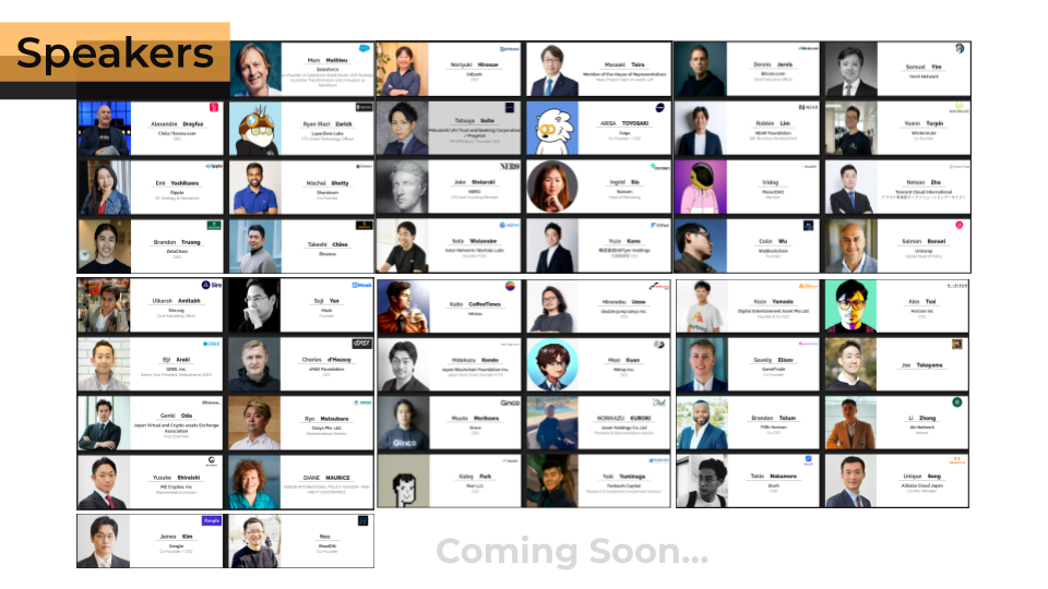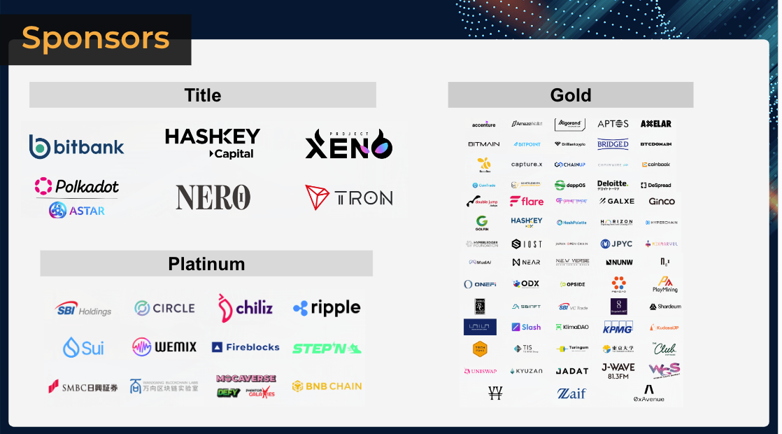 , double jump tokyo, Core Business Holdings s.r.o., horizon 株式会社, SBIホールディングス株式会社, DEA, GameTradeMarket, 日本投資株式会社(レーサム), JPYC株式会社, btcdomains, Circle, SIS株式会社, GALLUSYS, K.K, LOLLIPOP, Akinetwork, Chiliz, Ripple Labs Inc., coinbook, マーキュリー, TEAMZ, wemade, 株式会社bajji, Sui Foundation, 東京大学, Hyperchain, 株式会社Kyuzan, 遊戯苑, DeSpread, Astar, Polkadot, 在日スイス大使館 スイスビジネスハブ, 羽田未来研究所, Galxe, 0xavenue, Marketacross, Artilamps, Onefi