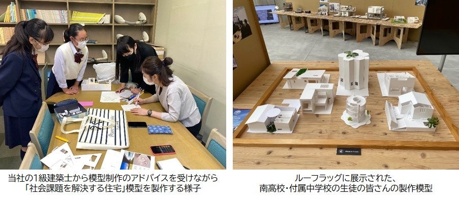 「次世代のグローバルビジネスリーダーの育成」を教育方針に掲げる南高校は、2015年より、課題探求型カリキュラム「TRY&ACT(トライ・アンド・アクト)」を実施しています。その一環として、高校1年生を対象とした企業講座を毎年開催しており、当社は2019年から「社会課題を解決する賃貸住宅」をテーマに、講義やワークショップを行っています。また2021年には、南高校・附属中学校の生徒が文化祭に展示する「社会課題を解決する住宅模型」の製作にサポーターとして参加。製作した模型は、2021年11月から2022年9月末(予定)の期間、ルーフラッグで開催中の建築展『未来を覗く、大東建託の建築展~Collaboration Projects~」で展示されています。