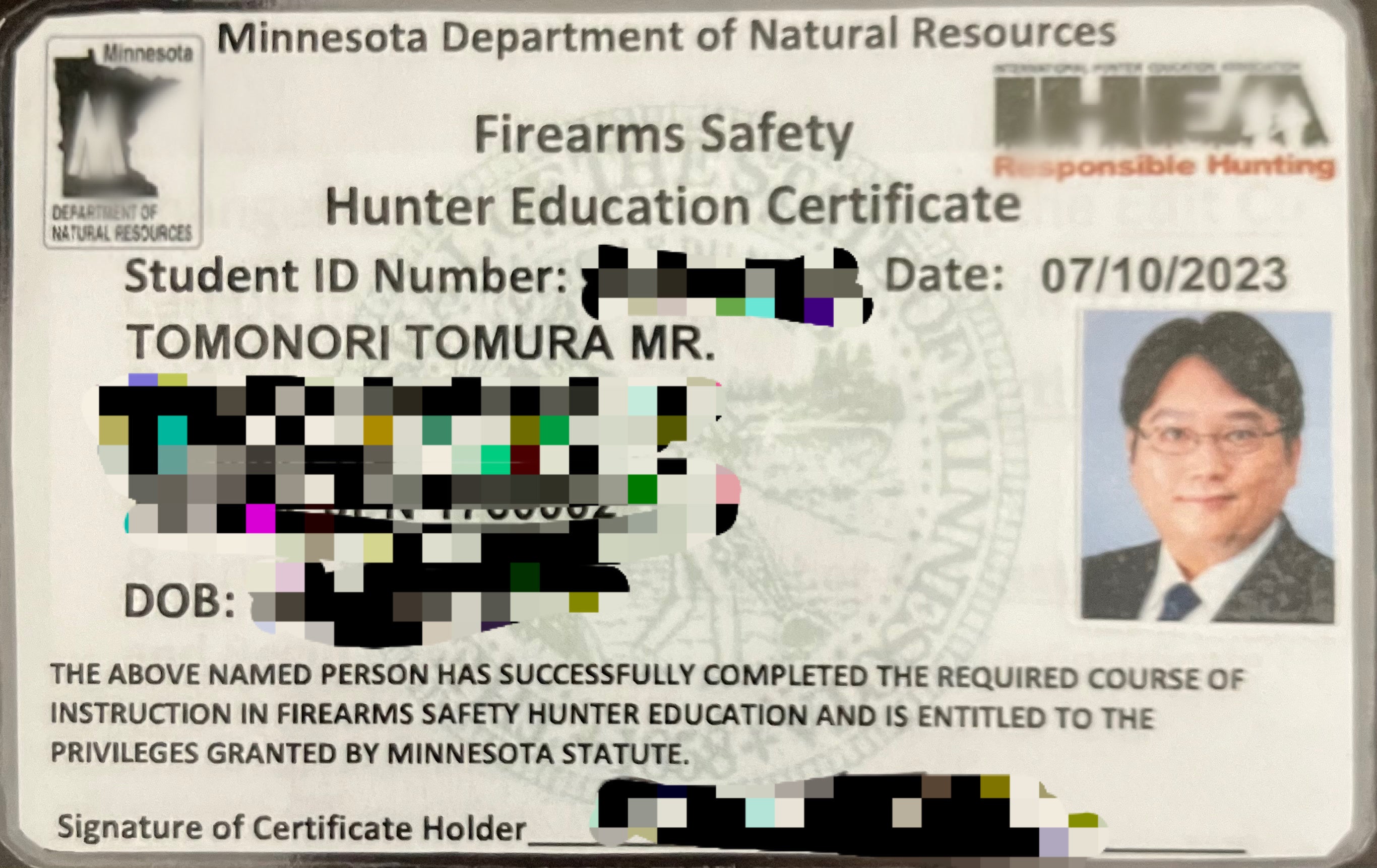 ・米国ミネソタ州ハンターエデュケーション修了証(HEC, Shotgun/Rifle/Handgun, etc. MDNR・IHEA)