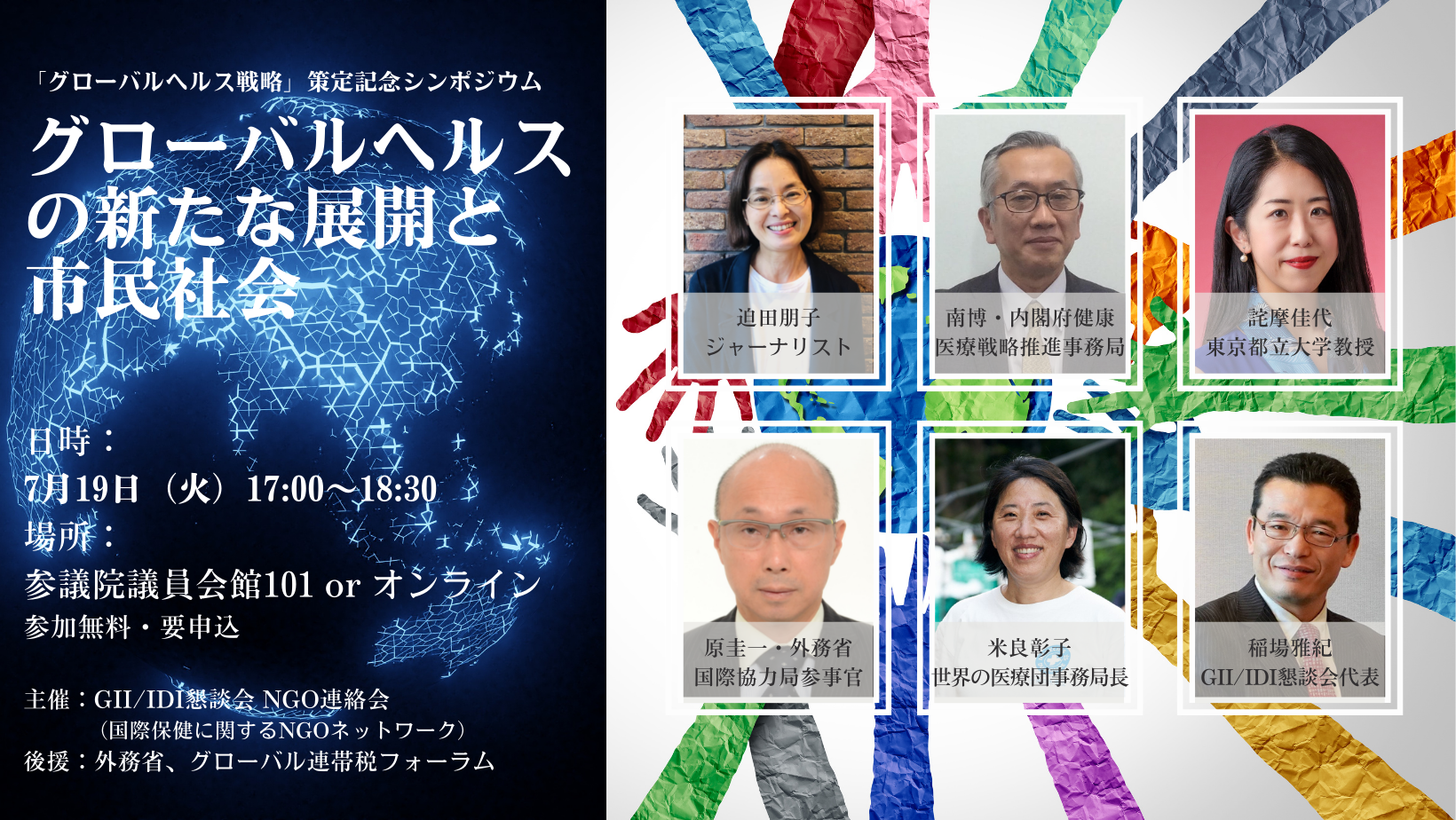 長引くコロナ禍や気候変動・自然災害、ロシアのウクライナ侵攻を引き金に、世界的な食糧危機や経済不安が続く2022年。G7およびG20サミットを目前とした、5月24日、日本政府はグローバルヘルス戦略を策定しました。7月19日(火)17:00より開催するこのシンポジウムでは、政府の策定したグローバルヘルス戦略を紐解き、パンデミックへの備えを確実にし、『すべての人に健康を』を実現するための政府・民間・公共・市民社会の新しい連携の在り方を考えます。世界が相次いで直面する危機や構造変化に対応し、戦略の内容を踏まえて、日本として国際保健をどうリードしてゆくのか、その中で日本の市民社会のあるべき姿を明らかにしていきます。