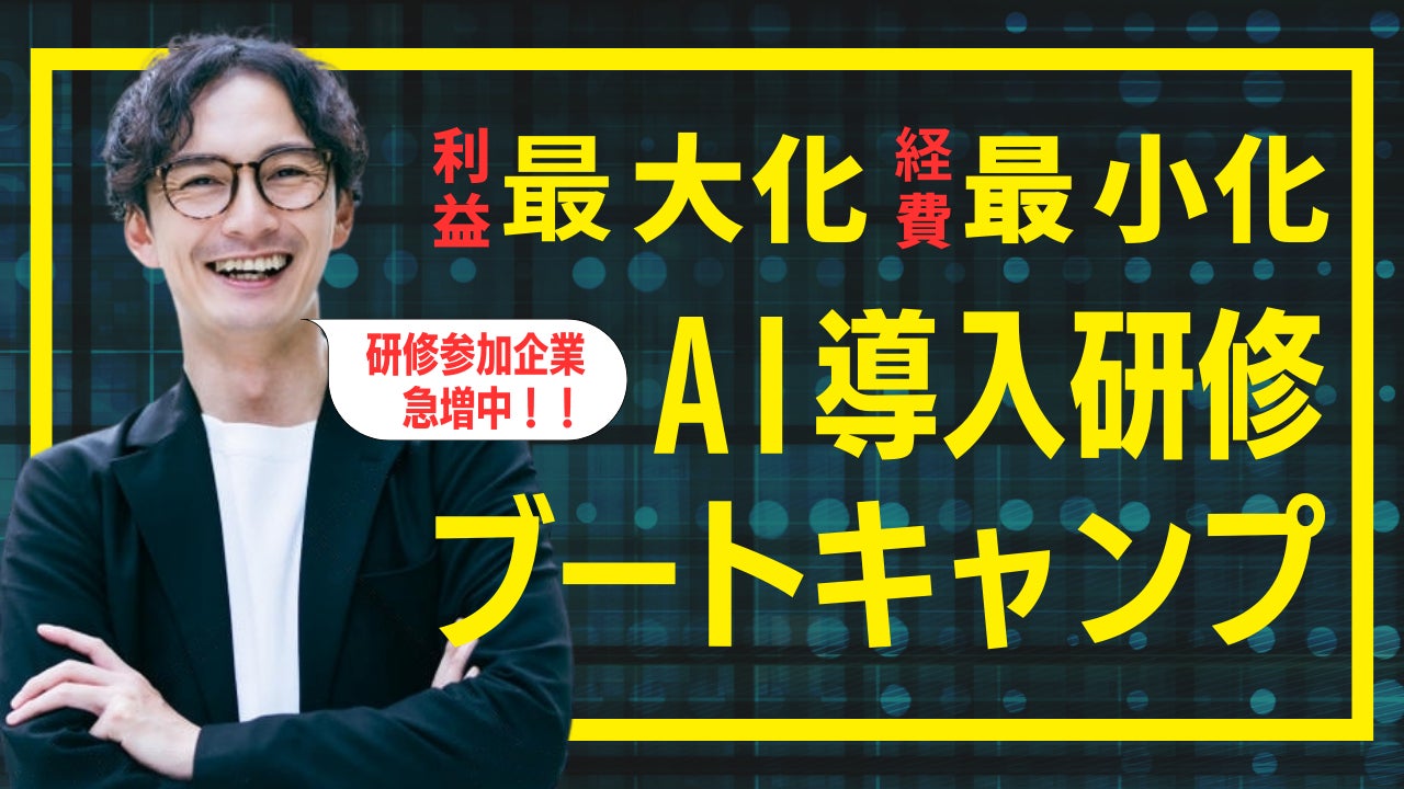 AI時代の到来に対応するため、AIの導入を検討している企業は、是非この機会に『AI導入研修ブートキャンプ』にご参加いただき、AIと共に会社の利益を最大化し経費を最小化させることで自社のリソースを大幅にアップさせることが現代のビジネスでの生き残り方なのかもしれない。