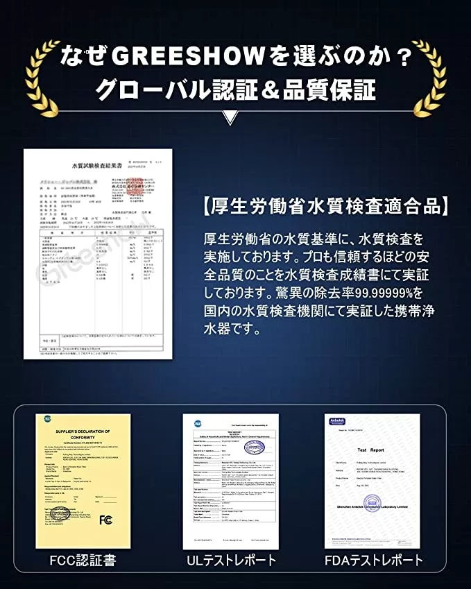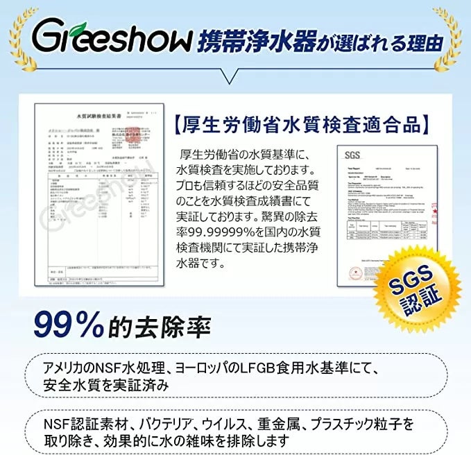 厚生労働省の水質基準に適合している、厚生労働省水質検査適合品です。その他、厳しい食用水の基準となる、FCC認証、FDAテスト、ULテストといった各国際認証も取得しています。99.9999%の寄生虫、細菌、ウイルスをろ過し、重金属、プラスチック粒子なども取り除きます。