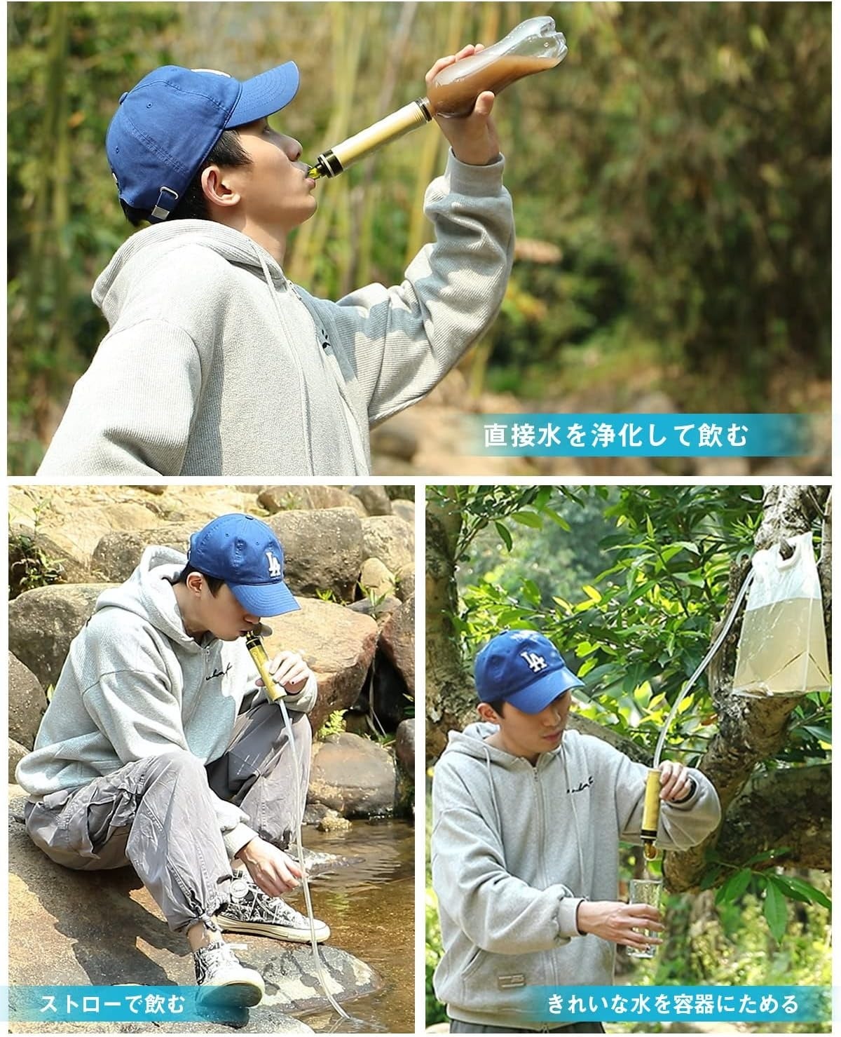 浄水速度は200 ml/分です。本体の取水側を直接水につけて浄水したり、付属のチューブでストローのように吸って浄水したり、給水バックに取り付けて浄水したり、一般的な口径のペットボトルに装着して浄水するなど、様々な方法で浄水することができます。サイズは32mm × 176mm × 32mm、重量はわずか58gで、収納袋も付属しています。非常用持ち出し袋に入れておくのにも最適です。ブルーとグリーンの2色が展開されています。