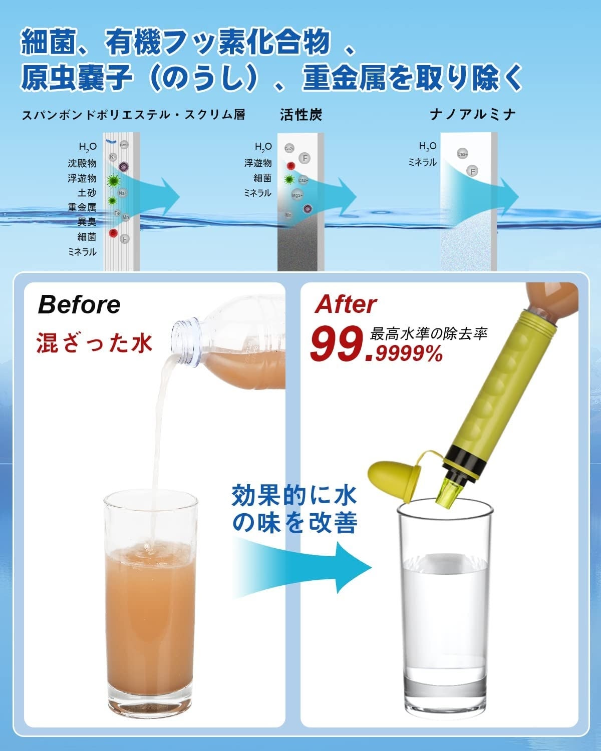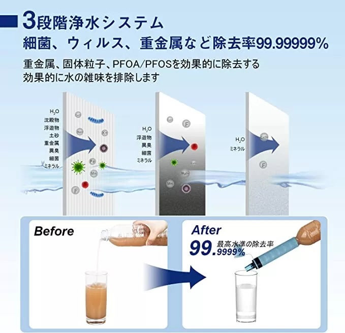 このフィルターでは、99.9999%の細菌と99.999%のウィルスを除去することができ、重金属、固体粒子、有機フッ素化合物も効果的に除去することができます。