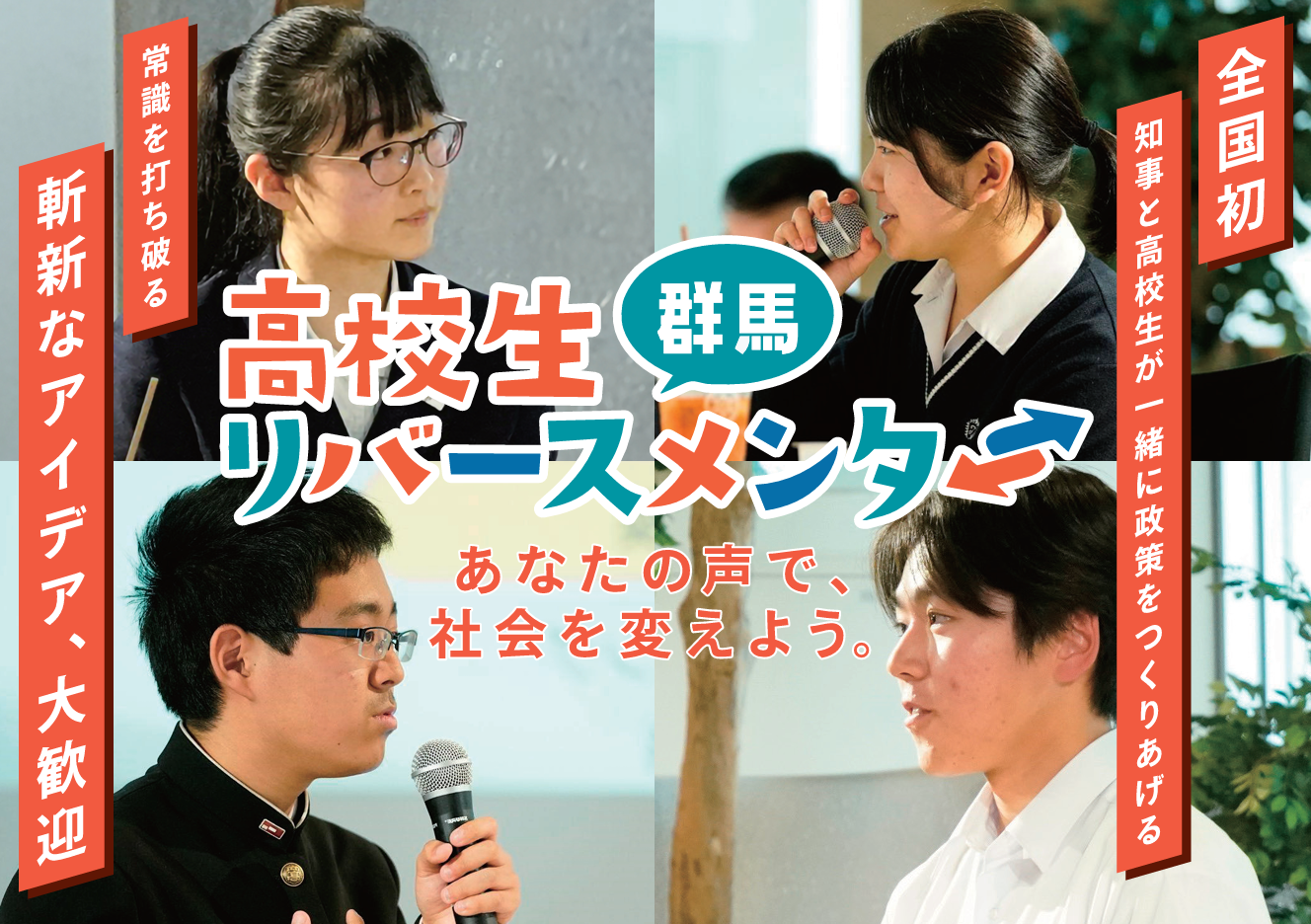 高校生が知事の相談役となって、知事に提案やアドバイスを行います。高校生が、政策について話し合い、提言し、提言されたものは群馬県で検討・実現されるものもあります。「若者の声」を単に“聞く”だけではなく、事業化までを目指します。群馬県内(在住or在籍)の高校生10名程度を知事のリバースメンターとして任命します。