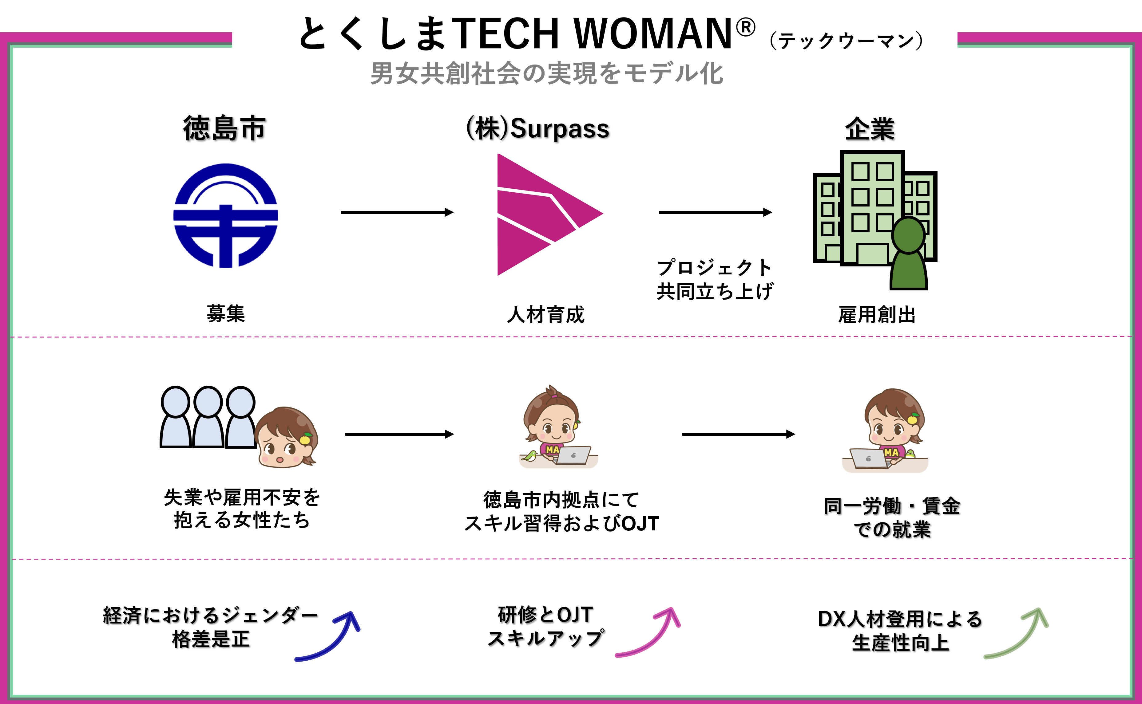 「とくしまテックウーマン」は、 徳島市とSurpassの連携協定に基づき、女性の就業率や収入の向上に向けて、育成から実働までワンストップで支援するとともに、地元企業のDX化の促進を図る取組みです。