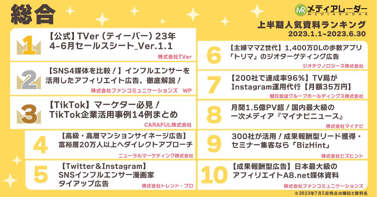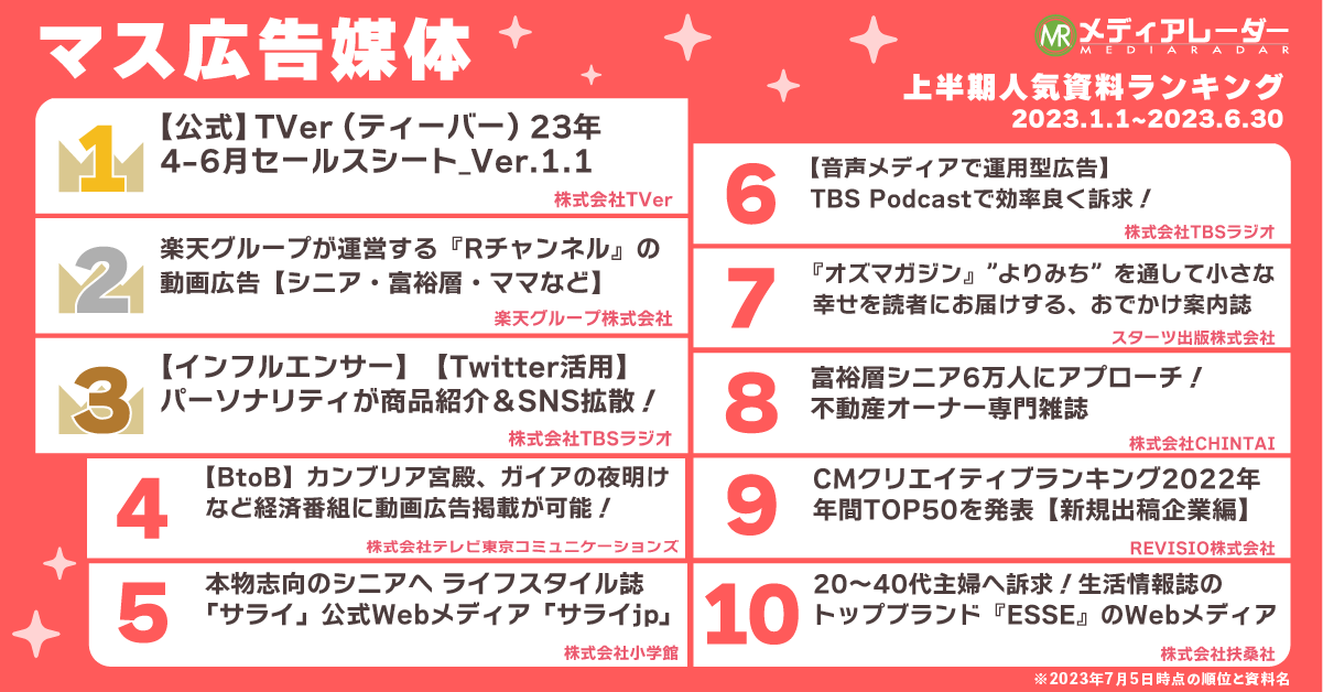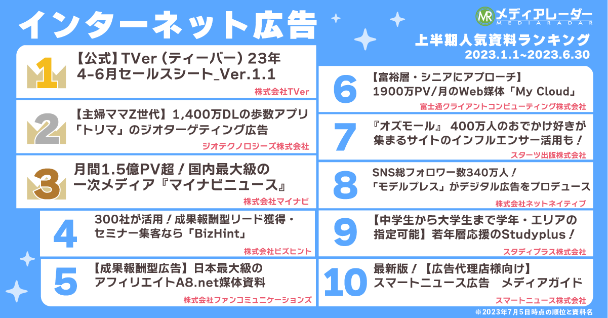 2023年上半期の累計でもっともダウンロードされた資料は、株式会社TVerの「【公式】 TVer(ティーバー)23年4-6月セールスシート_Ver.1.1」でした。この資料は2023年5月30日に発表した2023年1月~3月累計人気資料ランキング*³でも1位にランクインしており、このまま2023年年間人気資料ランキングで1位を獲得することも予想される勢いで、不動の人気を誇ります。