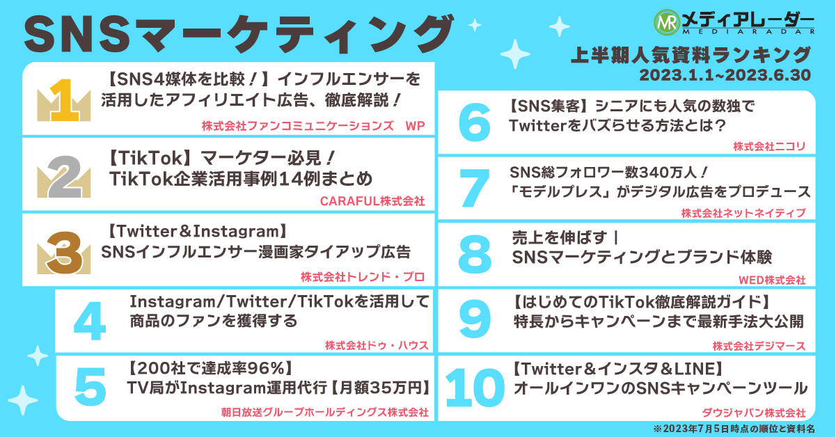 一見、SNSマーケティングの資料の移り変わりはあまりないように感じられますが、2022年上半期人気資料ランキング*⁴と比較した場合、今回のランキングでは4位の株式会社ドゥ・ハウスの「Instagram/Twitter/TikTokを活用して商品のファンを獲得する」や10位のダウジャパン株式会社の「【Twitter&インスタ&LINE】オールインワンのSNSキャンペーンツール」など1つのSNS媒体に限らずさまざまなSNS媒体の活用ができる汎用性の高いサービス資料の注目が高まっています。
