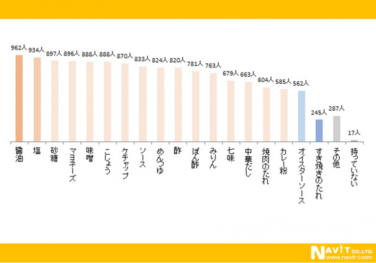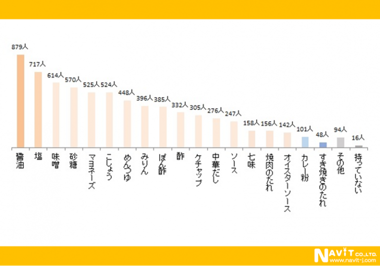 - 家にある調味料は1人平均14種で、トップは「醤油」