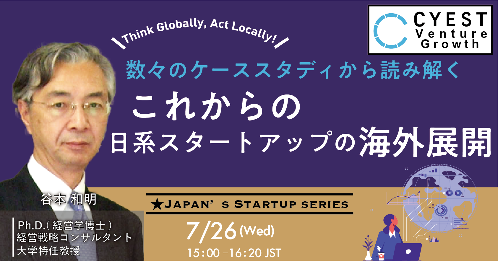 谷本教授は、スタートアップを既に起業したファウンダー、これから起業をしようと考えている方、または、日本のスタートアップに投資をしているベンチャー・キャピタリストのグローバルな観点の必要性に着目し、世界における日本の企業のポジショニング、なぜ国際競争で優れた実績を示していないかバックグラウンドを説明した上で、スタートアップの国際展開にどのように戦略を作成するか具体的なステップと具体的な事例をあげながら解説します。
