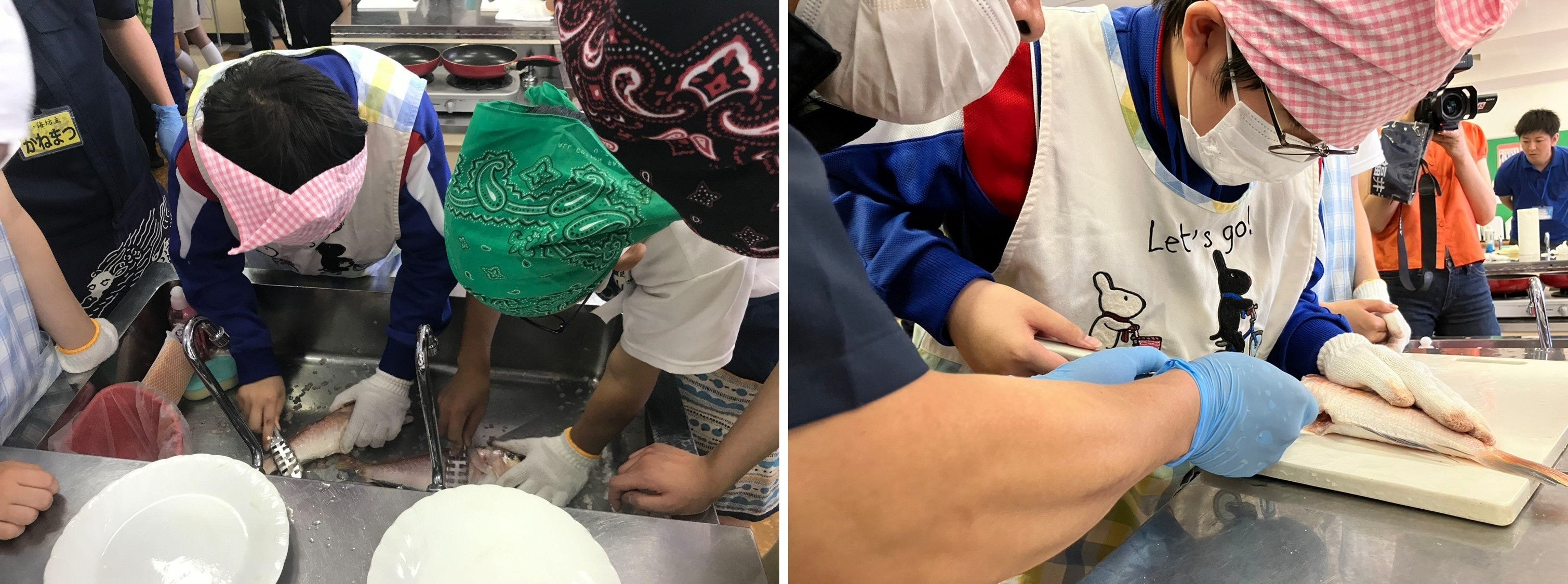 まずは、アマダイの干物の味や作り方を知る必要があるので、実際にアマダイを自分でさばく調理体験をしました。うろこ落としまでは簡単にできたものの、アマダイの堅い表面や、柔らかい身にみんな四苦八苦。伝食さんのサポートを受けながら、なんとかみんなでさばくことができました。さばく行程や大変さを知って、調理をする人への感謝の気持ちや技術のすごさを学んだ隊員たち。自分でさばいたからこその達成感や特別感はひとしおです。焼きあがったムニエルや干物を食べた隊員からは「あまくて美味しい!」「この味を早くみんなに届けたい」といった声があがっていました。