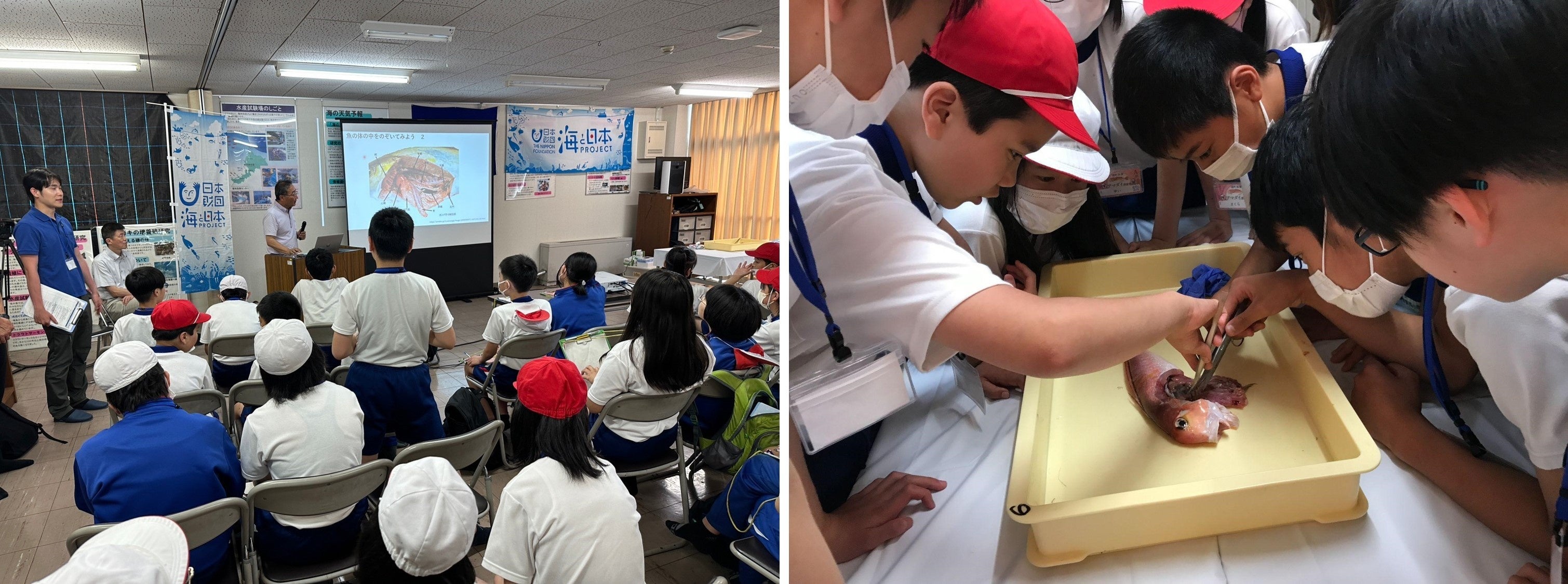 お昼にアマダイの焼き物を食べ、福井県水産試験場に会場を移して午後の部がスタート。巣穴に住んでいるアマダイの貴重なビデオなどを見ながら、福井県立大学海洋生物資源学部の富永先生より、アマダイの生態について教えていただきました。「アマダイについてもっと知ろう!」ということで、隊員はアマダイの解剖にも挑戦。先生の指導のもとアマダイのお腹にはさみを入れていきます。初めての体験に隊員たちはドキドキ。怖がる子もいるかと予想していましたが、当日は「やってみたい」という声であふれ、子どもたちは積極的に体の中を調べていました。