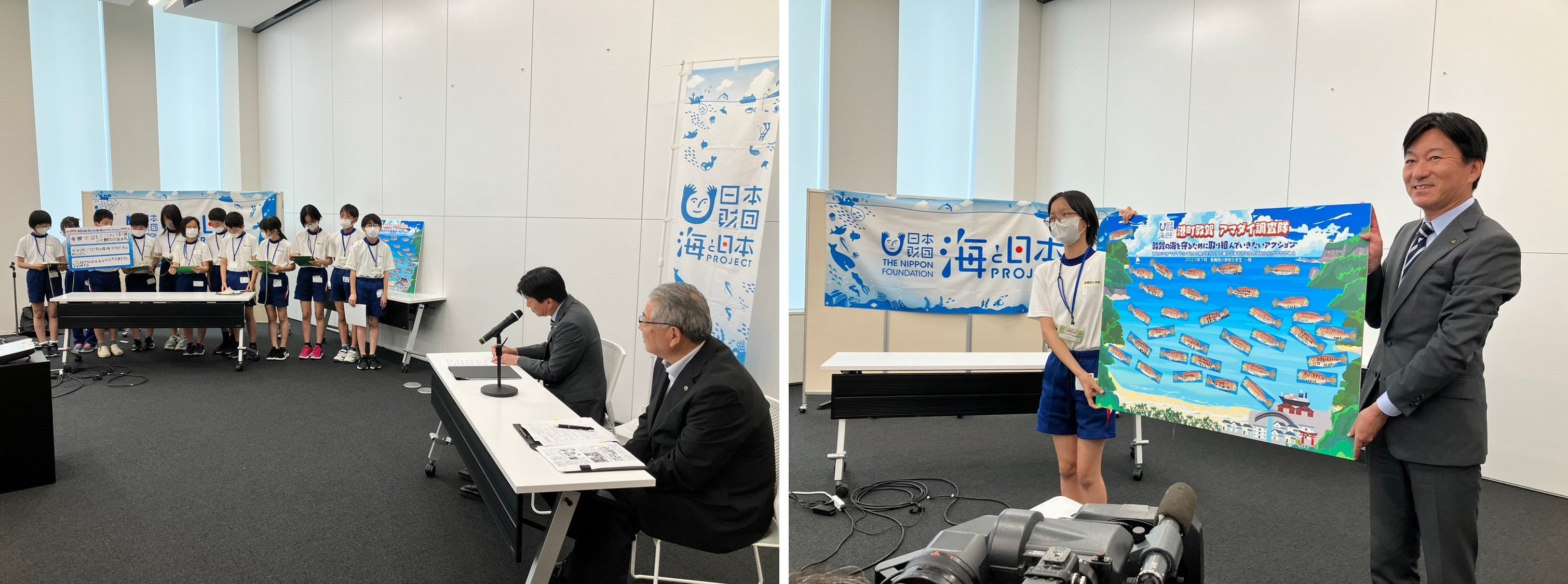 2日間にわたり、敦賀市の海を調査した子どもたち。「これからもアマダイやたくさんの魚が生きやすい豊かな海を守るために私たちができることは何だろう?」美しく豊かな敦賀の海を守るために取り組んでいきたいアクションをみんなで考えました。「敦賀の海についてもっと知る、伝える」「敦賀でとれた魚をおすすめする」「ごみを減らすなど魚が過ごしやすい環境づくりをする」など、一人ひとりができることをアマダイ型のシールに書き込み、敦賀湾が描かれたボードに貼り付けていく隊員たち。その成果をまとめ、敦賀市長と教育委員長をお招きし発表、みんなで制作した『港町敦賀アマダイパネル』を市長に贈呈しました。市長の前で発表する機会というものは、なかなかあるものではありません。隊員たちは緊張しながらも、しっかり自分の言葉で伝えることができていました。発表を受け、敦賀市長からは「これからも誇りを持って、敦賀は良いところだなと思って過ごしてほしい」、また、教育委員長からは「将来、皆さんがふるさと敦賀のために活躍してくれることを期待しています」とのお言葉をいただきました。最後に、2日間の学びをきっかけにこれからも、敦賀のきれいな海を守り、伝えていけるよう取り組んでいくことをみんなで誓い合いました。