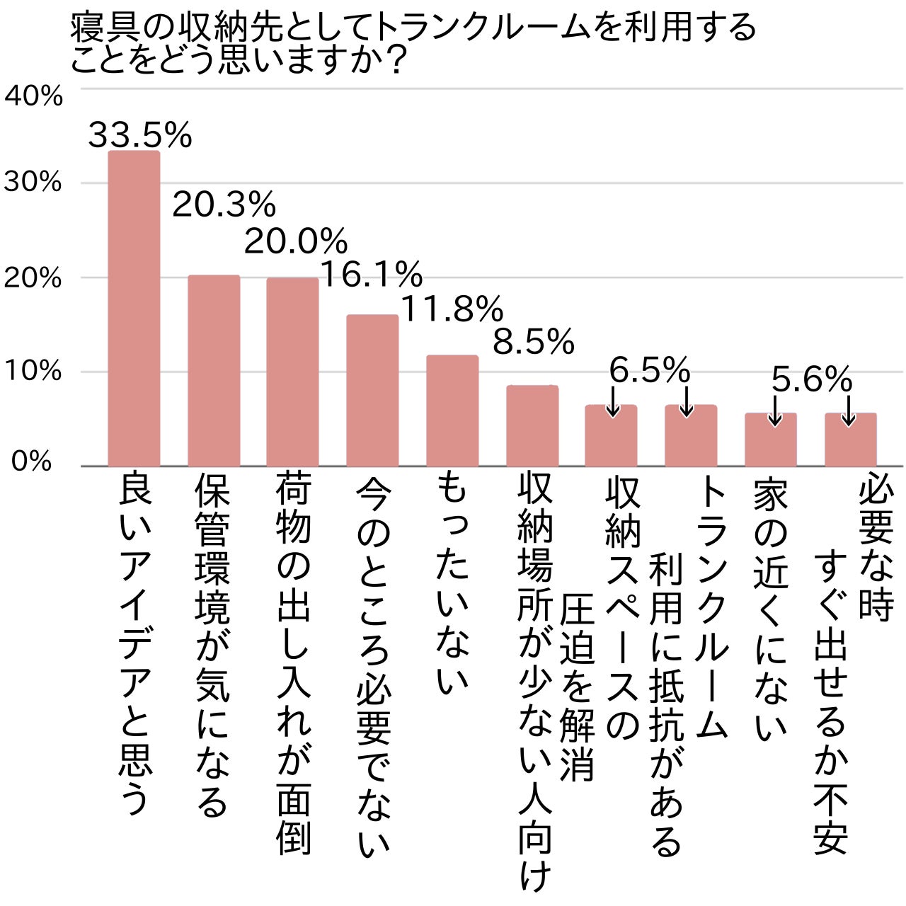 トランクルームを利用することについて、良いアイデアだと感じた方は33.5%で第1位でした。ただし、湿度管理や防虫・防カビ等の保管環境が気になる(20.3%)と答えた方が多く見られました。