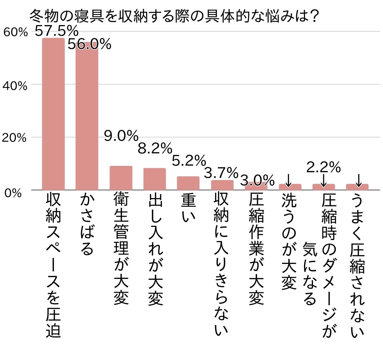 「収納スペースが布団で埋まってしまう」「収納スペースに無理やり押し込む」という表現をする方がよく見られるほど、冬物の寝具はかさばって収納スペースの多くを占め、使わない時期にも邪魔になってしまう現実があるようです。