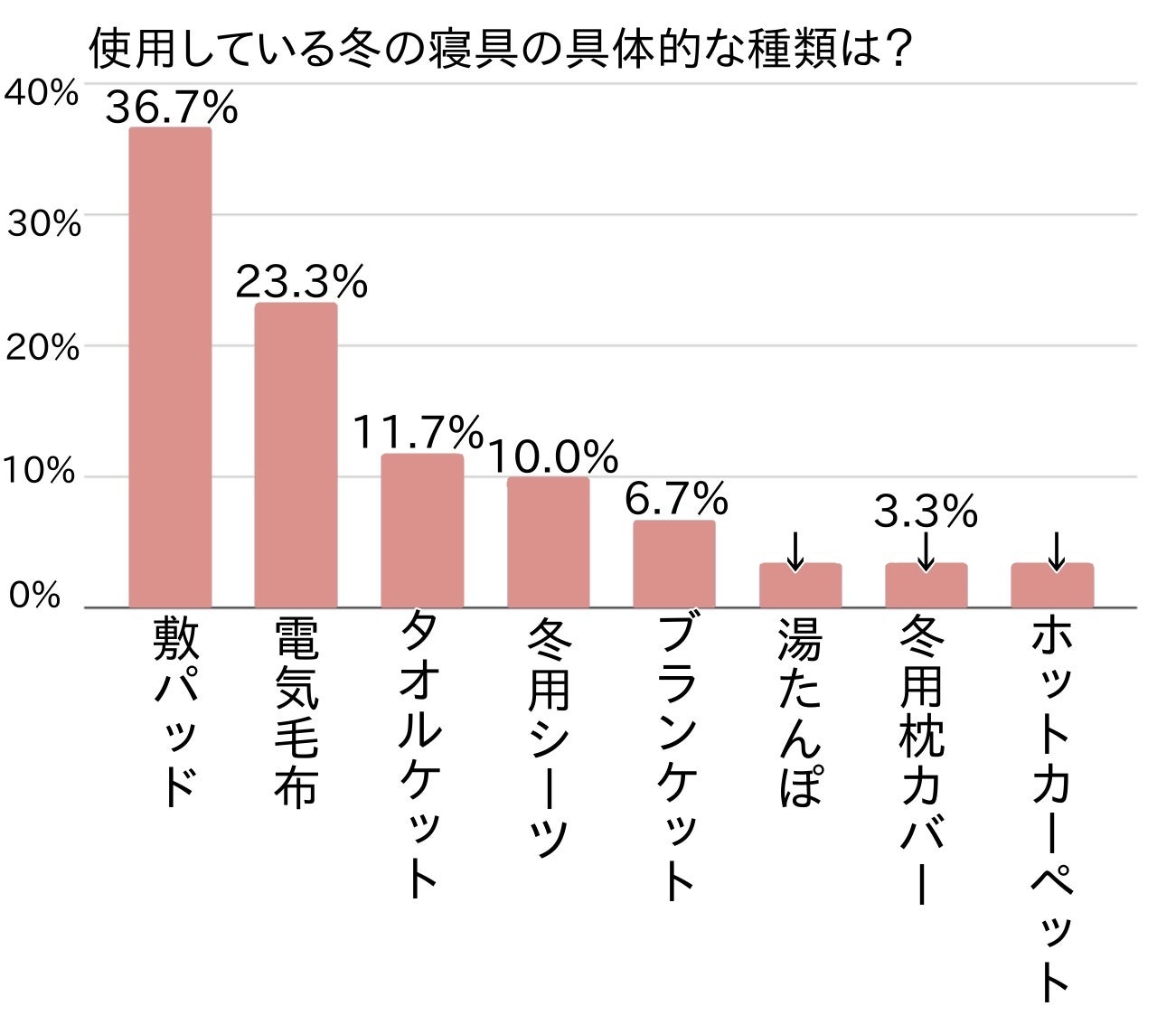 基本プラスアルファの寝具として一番人気が高かったのは敷パッドで、36.7%でした。敷布団側の肌に当たる部分の風合いが柔らかく暖かいものになると非常に暖かく感じられ、寒い日の床から感じられる冷えた空気の感覚が軽減できます。冬用シーツ(10.0%)や冬用枕カバー(3.3%)も、肌に当たる部分の風合いを冬らしい暖かさの生地にするという点では共通しているといえるでしょう。
