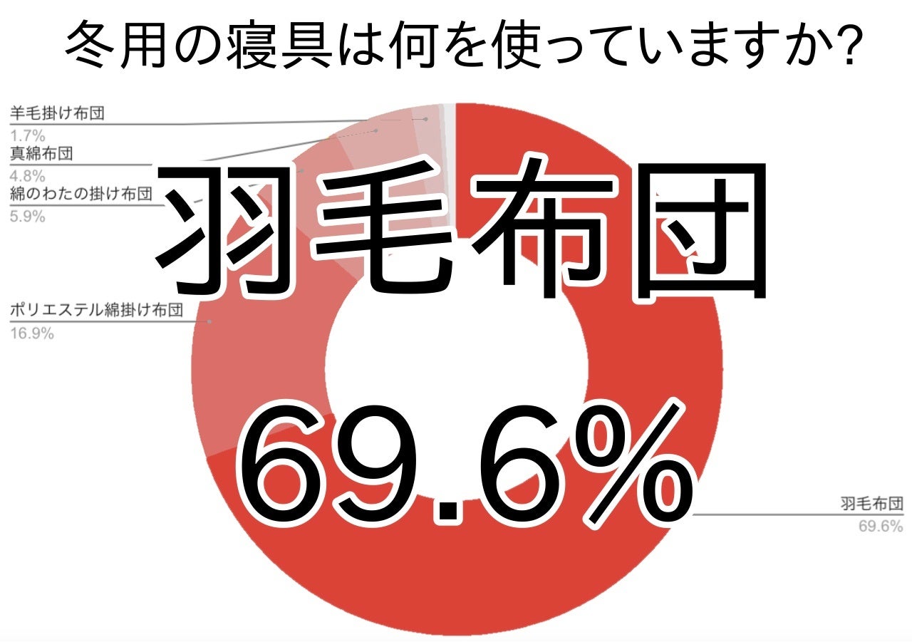 今回のアンケートでは、冬用の寝具として羽毛布団を使っていると答えた方は69.6%でした。つまり、ふわふわと空気を含んであたたかい羽毛布団が約7割の方に支持されています。他にも、ポリエステル綿の掛け布団等、しっかりとした厚みのある寝具を利用していることがわかりました。