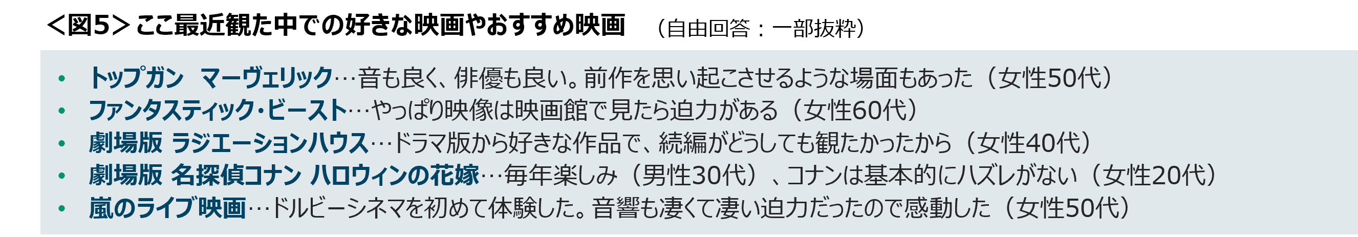 最近観た好きな映画・おすすめ映画は「トップガン マーヴェリック」「ファンタスティックビースト」「劇場版 名探偵コナン」など、洋画・邦画問わずシリーズものや続編が人気。<図5>