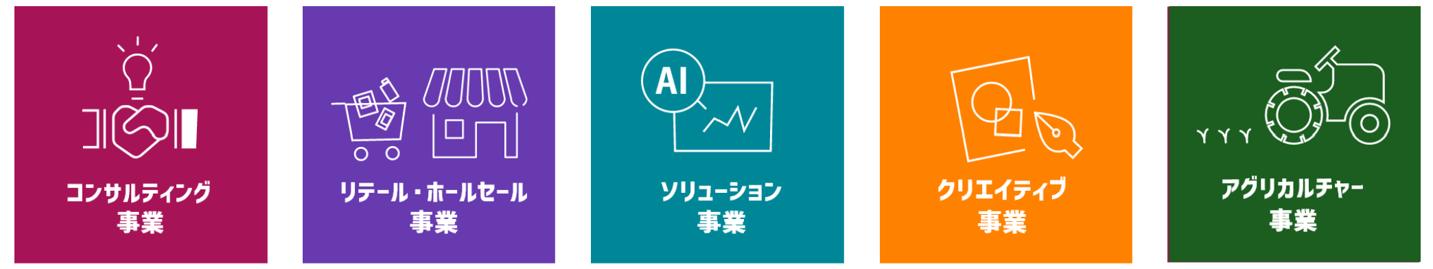 当社では「実践するコンサルティング」を行動原則として経営してまいりました。その過程でコンサルティング領域に関連する「小売事業」「デザイン事業」「ITソリューション事業」「農業事業」といった、事業者の皆様が必要とする「実践的な」ソリューションの提供をするための事業展開をしてまいりました。