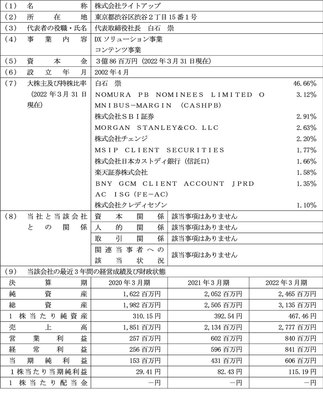 2022年7月13日      ライトアップとの資本業務提携に関する取締役会決議