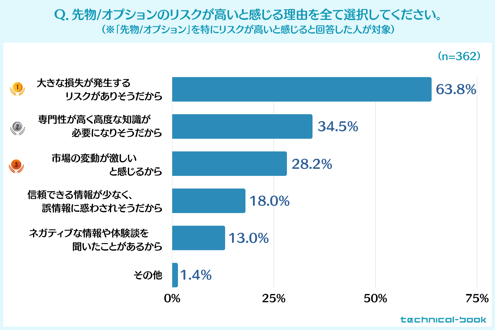 特にリスクが高い投資として「先物/オプション」を回答した人を対象に理由を質問したところ、1位は「大きな損失が発生するリスクがありそうだから」の63.8%、2位は「専門性が高く高度な知識が必要になりそうだから」の34.5%、3位は「市場の変動が激しいと感じるから」の28.2%となりました。
