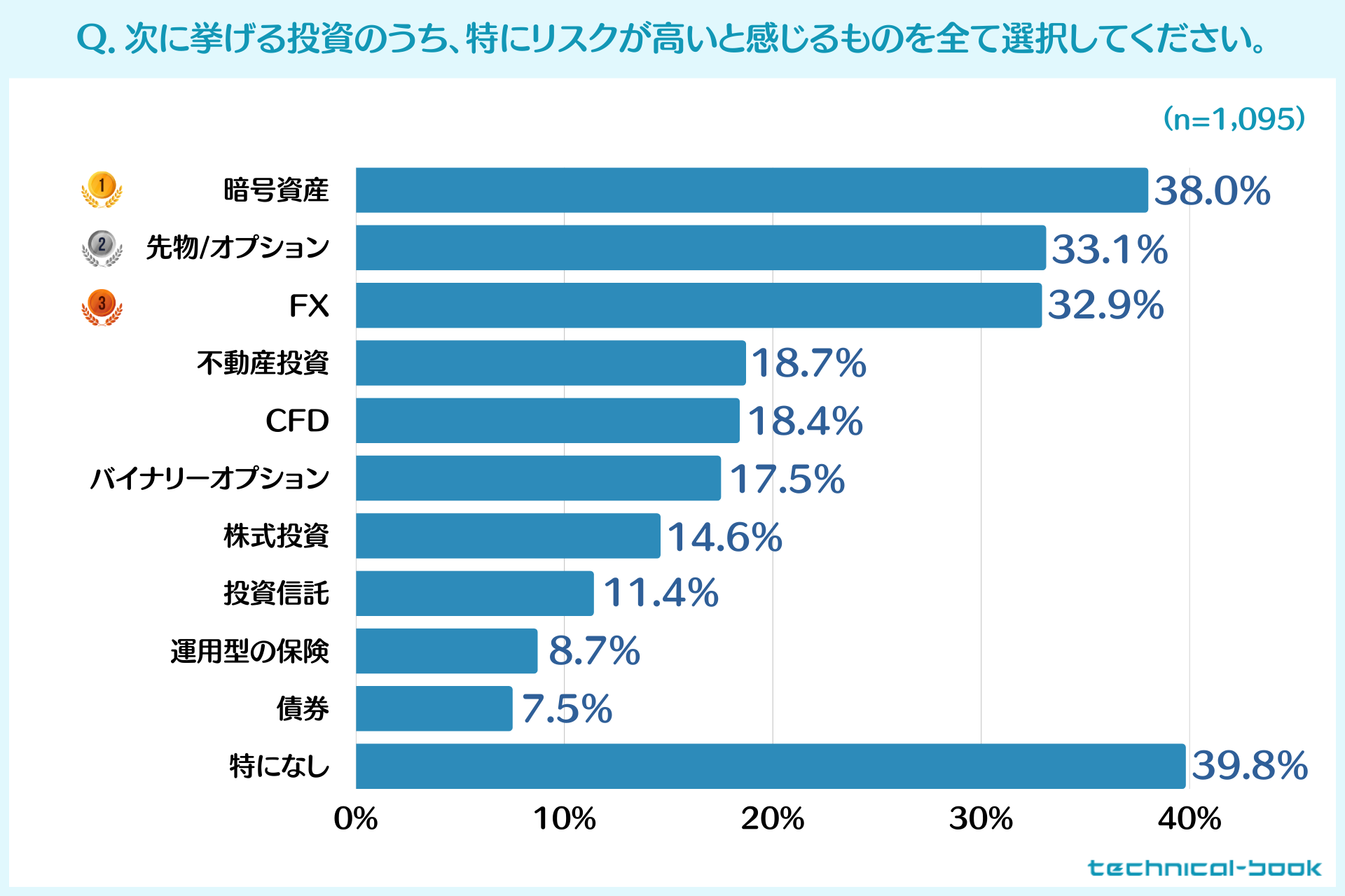 1.投資未経験者がリスクが感じやすい投資1位は「暗号資産」で38.0%、2位は「先物・オプション」の33.1%、3位は「FX」の32.9%