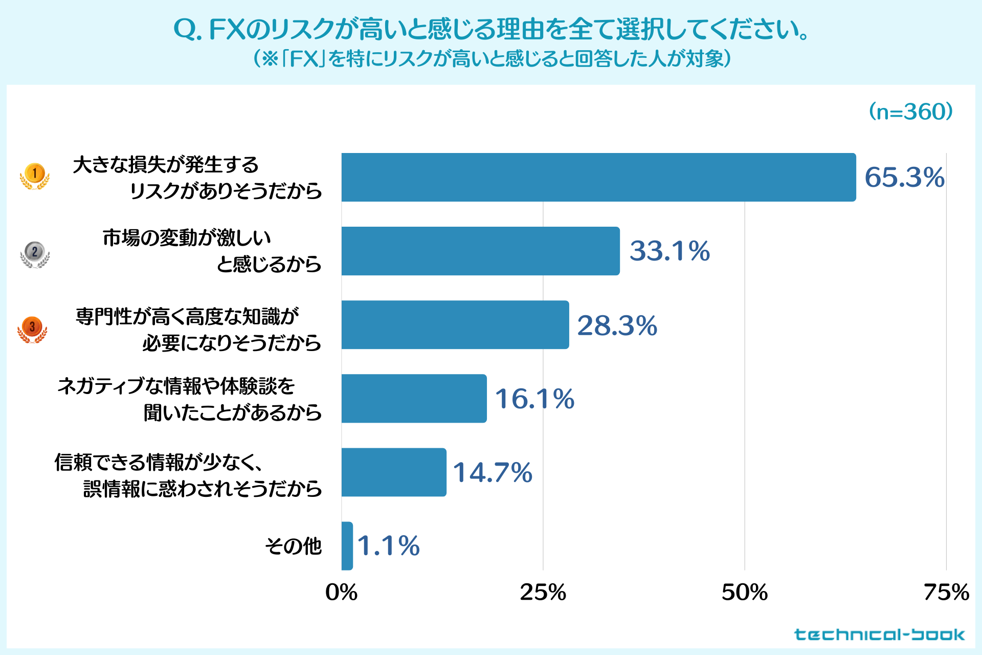 特にリスクが高い投資として「FX」を回答した人を対象に理由を質問したところ、1位は「大きな損失が発生するリスクがありそうだから」の65.3%、2位は「市場の変動が激しいと感じるから」の33.1%、3位は「専門性が高く高度な知識が必要になりそうだから」の28.3%となりました。